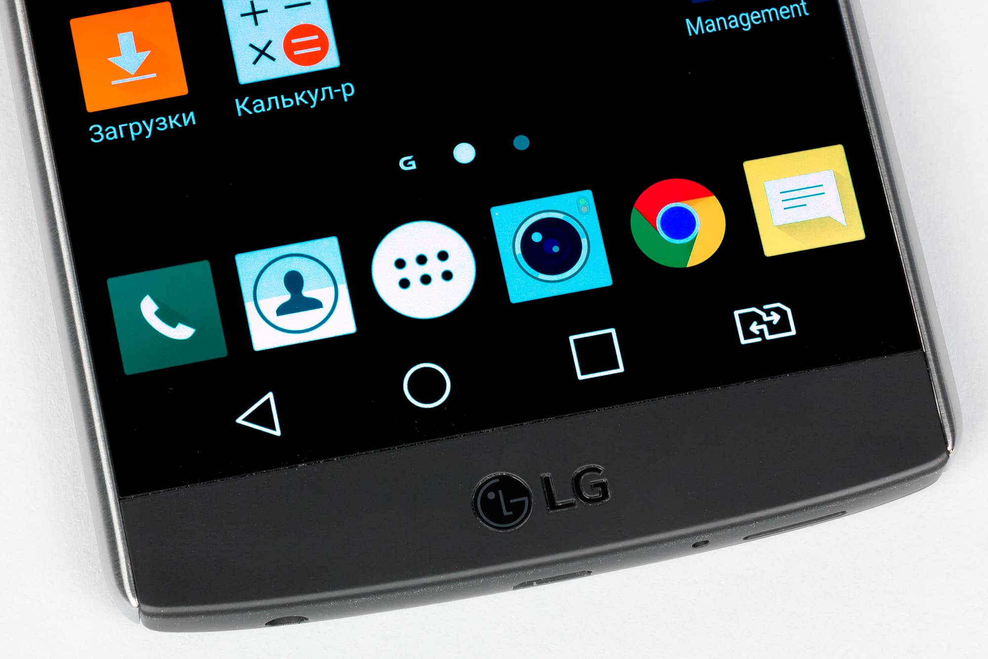 LG V10 оснащен двумя экранами, расположенными друг над другом на одной фронтальной плоскости, и прикрыты они единым защитным стеклом Gorilla Glass 4. Стекло серьезно затонировано, и если не знать из описания, что тут два экрана, самому догадаться об этом будет трудно — никаких швов и переходов между ними не видно.