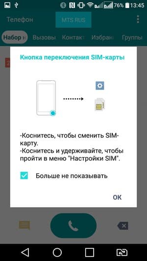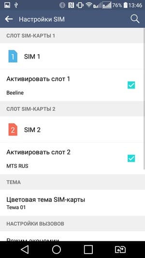 Смартфон обеспечивает работу с двумя SIM-картами по стандарту Dual SIM Dual Standby. Не считая специальной кнопки для быстрой смены приоритетной SIM-карты, реализация работы с двумя SIM-картами в целом стандартна для данной платформы. Радиомодуль здесь один, поэтому активный разговор может быть только один. С сетями 3G/4G может работать SIM-карта в любом слоте, однако одновременно в этом режиме может работать лишь одна из карт (вторая будет работать только в 2G). Выбор между двумя SIM-картами для осуществления вызова, отправки SMS и пр. традиционно для аппаратов LG осуществляется с помощью отдельной кнопки быстрого переключения приоритетной карты, расположенной в ряду виртуальных кнопок управления.