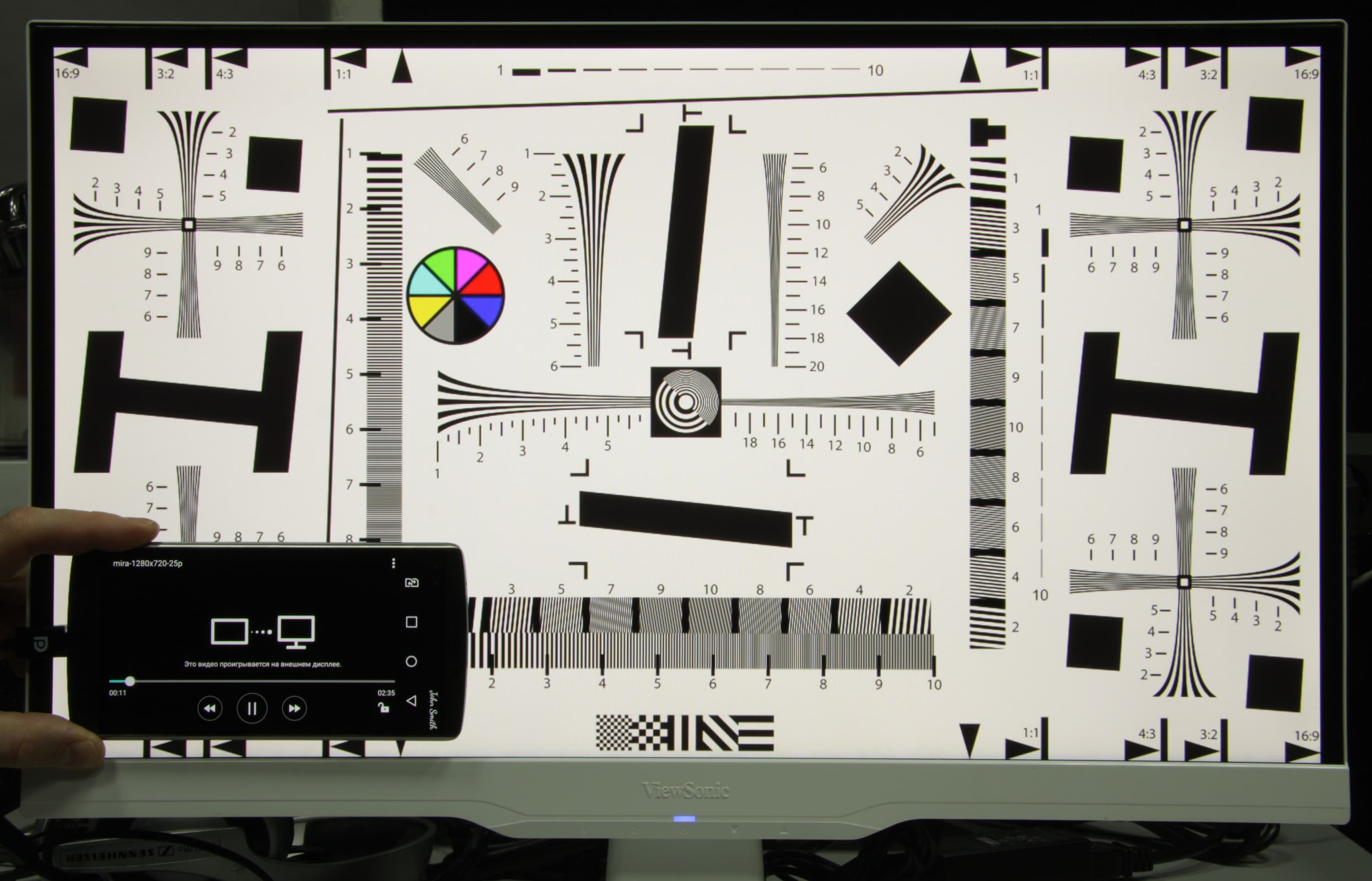 Особого описания заслуживает вывод видео. Для начала с помощью набора тестовых файлов с перемещающимися на одно деление за кадр стрелкой и прямоугольником (см. «Методика тестирования устройств воспроизведения и отображения видеосигнала. Версия 1 (для мобильных устройств)») мы проверили, как видео выводится на экран самого смартфона. Снимки экрана с выдержкой в 1 с помогли определить характер вывода кадров видеофайлов с различными параметрами: варьировались разрешение 1280 на 720 (720p), 1920 на 1080 (1080p) и 3840 на 2160 (4K) пикселей и частота кадров 24, 25, 30, 50 и 60 кадр/с. В этом тесте мы использовали видеоплеер MX Player в режиме «Аппаратный». Результаты этого (блок, озаглавленный как «Экран смартфона») и следующего теста сведены в таблицу: