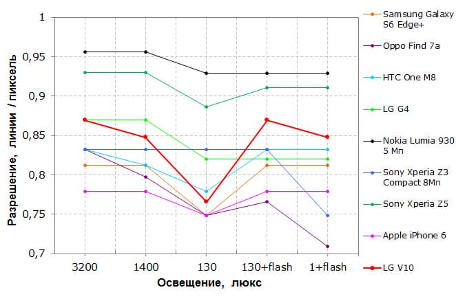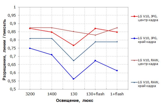 Насыщенность в случае LG V10 явно завышена. Как показали дополнительные тесты, это завышение достигается как за счет широкого охвата, так и за счет небольшого повышения цветового контраста. Также отметим, что красный цвет имеет слегка неестественный оттенок (визуально это заметно лучше, чем на фотографии, особенно на помидорах). Кроме того, на изображениях видно, что в какой-то степени увеличивается и контурная резкость. По всей видимости, такая обработка изображения выполняется программно на очень низком уровне, так как ее результат виден во всех опробованных программах, выводящих растровые изображения.