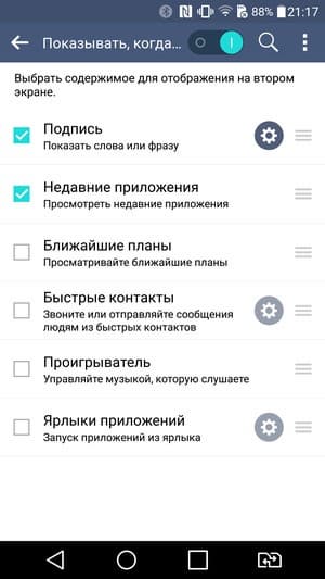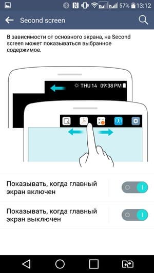 Никуда не исчез и фирменный режим Knock Code, хотя теперь разблокирование смартфона гораздо удобнее выполнять с помощью сканера отпечатков. Комбинацию виртуальных кнопок управления в нижней части экрана можно изменить и подстроить под свой вкус, реализована поддержка жестов. Правда, здесь отсутствует ставшая уже привычной в смартфонах LG функция быстрого просмотра даты, времени, входящих сообщений жестом сдвига вниз без необходимости включать экран (Glance View) — она не нужна ввиду наличия второго, постоянно функционирующего дисплея.