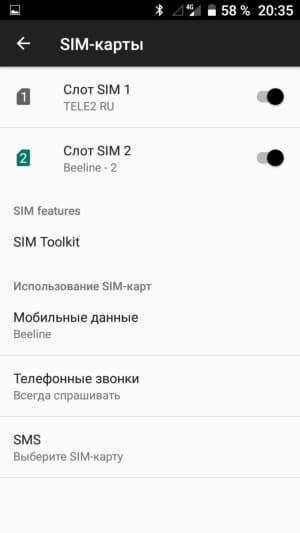 Смартфон не поддерживает работу с двумя SIM-картами 3G и 4G одновременно. То есть карты таких операторов, как Tele2, не будут работать в 3G на голосовую связь, если под передачу данных в 4G назначена карта из другого слота. Интерфейс позволяет выбрать для каждой из функций определенную карту заранее или прямо во время соединения. Работают карты в режиме Dual SIM Dual Standby, радиомодем здесь один.