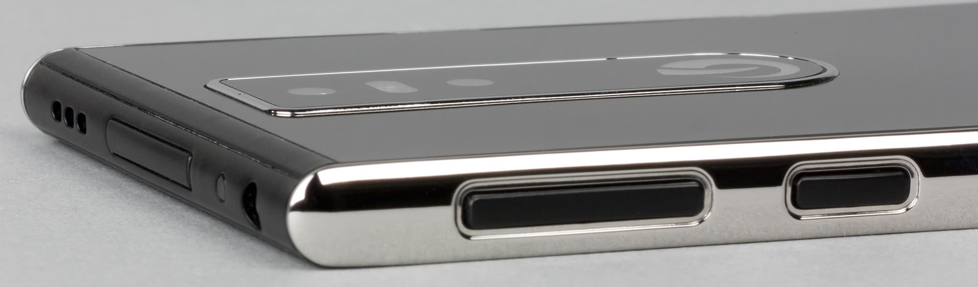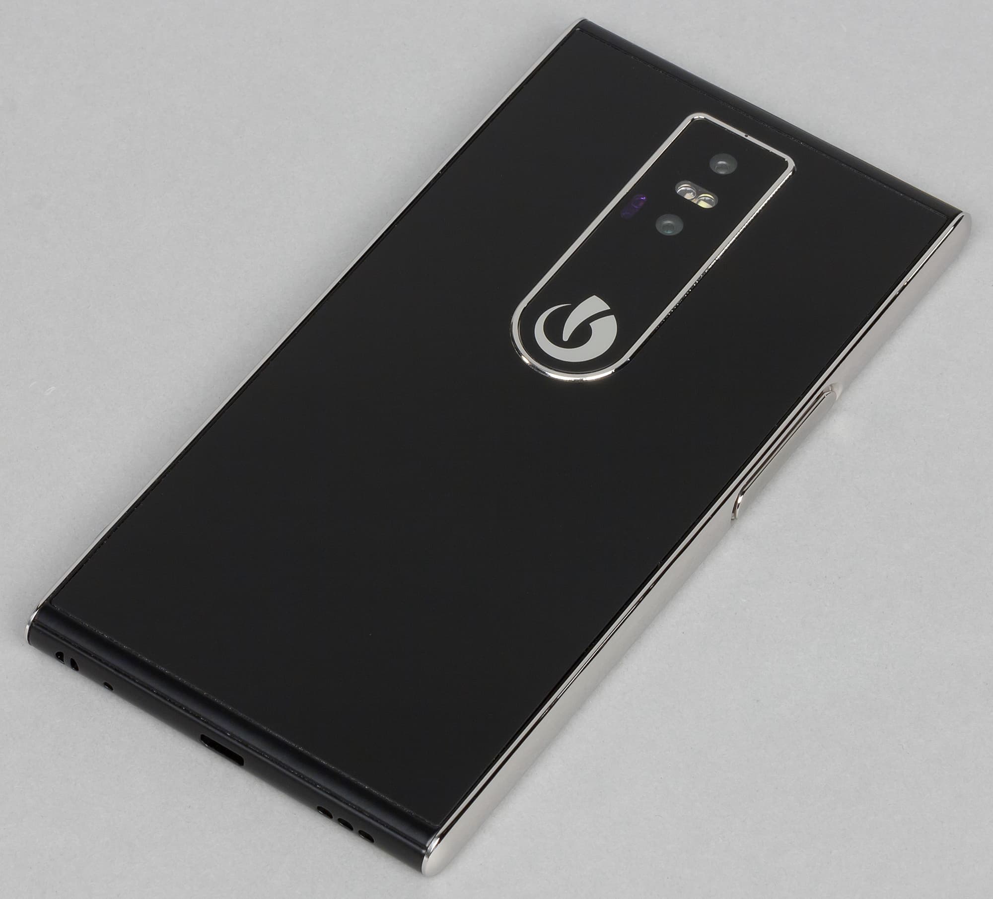 Тыльная сторона, как и передняя панель, прикрыта плоским защитным стеклом без 2.5D-эффекта. Все элементы на задней панели объединены в единый, чуть выпирающий наружу модуль. В него встроены две камеры: одна обычная, со сдвоенной двухтональной вспышкой, а другую разработчик обозначил как «камеру ночного видения с двойной ИК-вспышкой». Помимо этого, в модуль вписана сенсорная площадка, с помощью которой можно перелистывать веб-страницы и фотографии в галерее. Все эти элементы врезаны почти вровень со стеклом панели, поэтому смартфон на столе лежит устойчиво, не покачивается при прикосновениях к экрану.