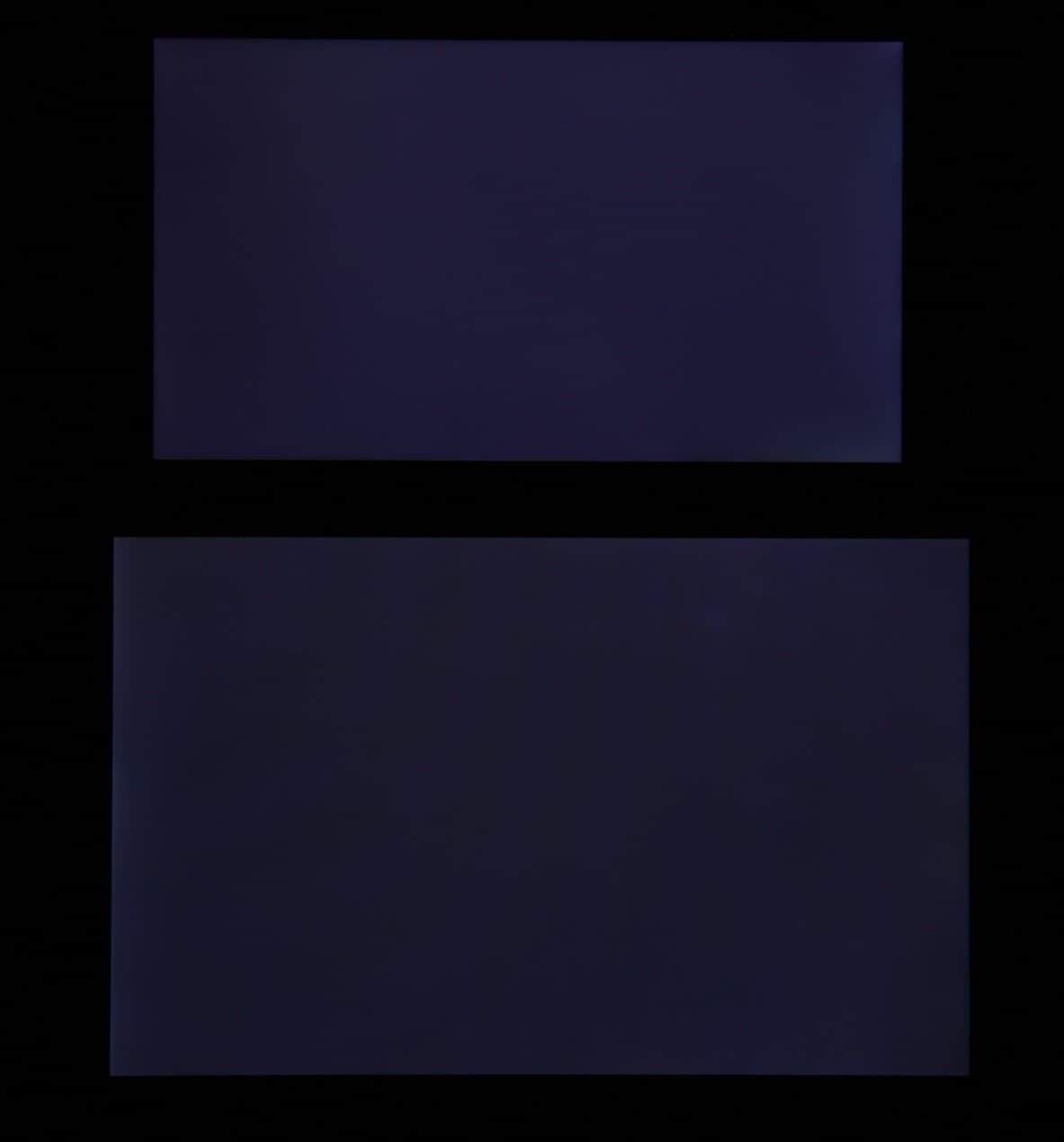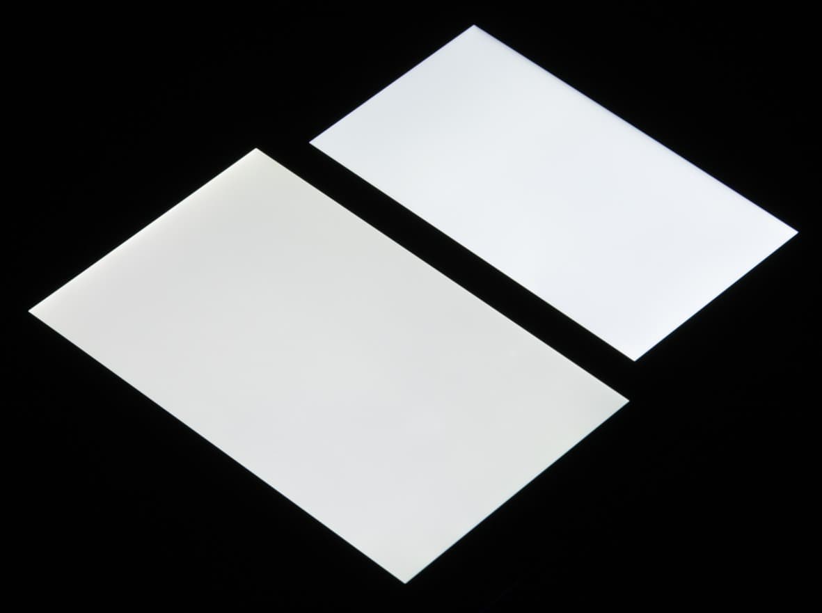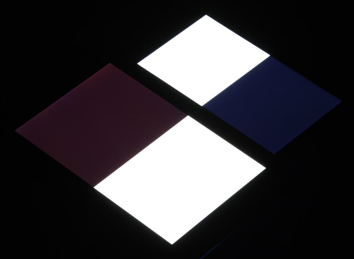 Яркость под углом у экранов уменьшилась (как минимум в 4 раза, исходя из разницы в выдержке), но у Maze Alpha снижение яркости меньше. Черное поле при отклонении по диагонали высветляется слабо и приобретает синеватый оттенок. Фотографии ниже это демонстрируют (яркость белых участков в перпендикулярном плоскости экранов направлении одинаковая!):