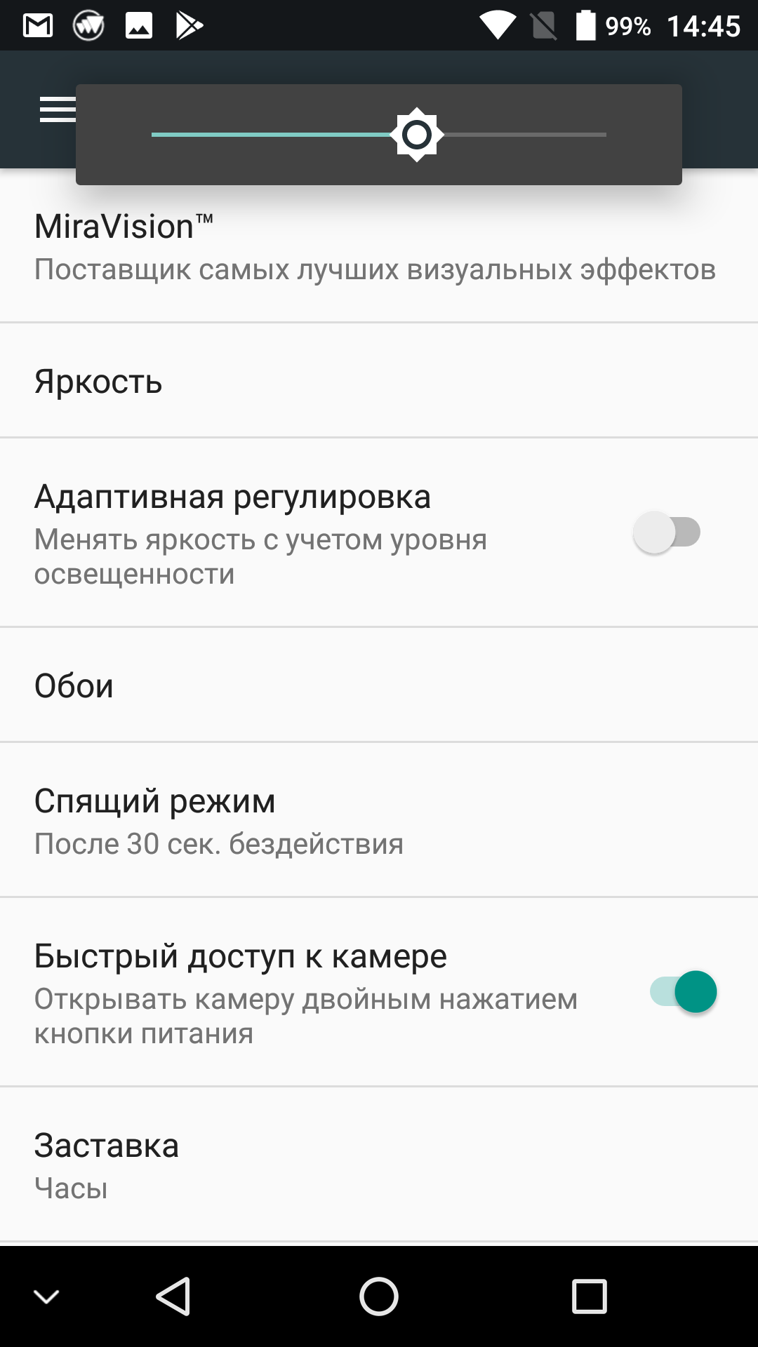 Яркость дисплея можно подстраивать вручную или использовать автоматические настройки, основанные на работе датчика внешнего освещения. Тесты мультитач диагностируют поддержку 5 одновременных касаний. Активация экрана с помощью постукивания не предусмотрена.