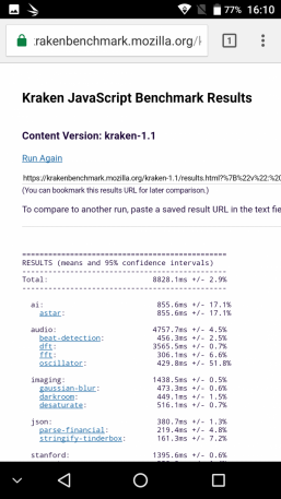 Что касается бенчмарков для оценки скорости движка javascript, то стоит всегда делать скидку на то, что в них результаты существенно зависят от браузера, в котором запускаются, так что сравнение может быть истинно корректным только на одинаковых ОС и браузерах, а такая возможность имеется при тестировании не всегда. В случае с ОС Android мы всегда стараемся использовать Google Chrome.
