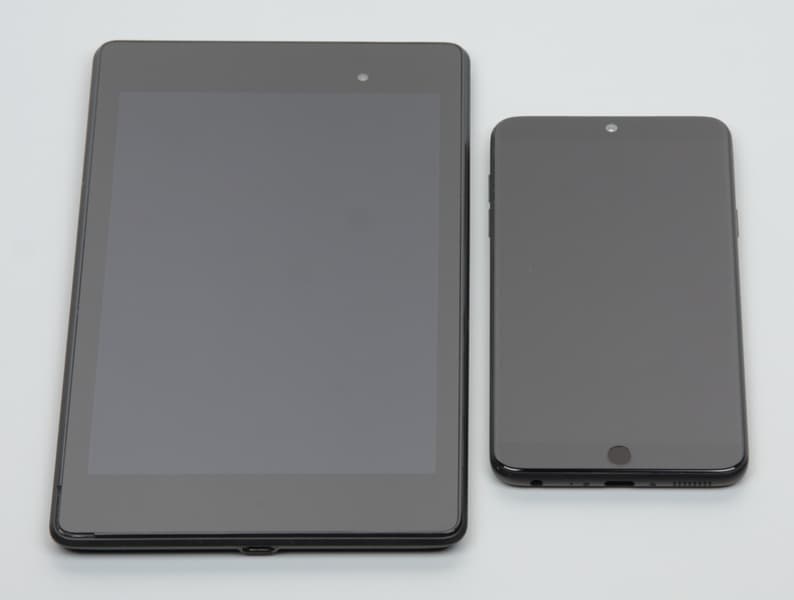 Лицевая поверхность экрана выполнена в виде стеклянной пластины с зеркально-гладкой поверхностью, устойчивой к появлению царапин. Судя по отражению объектов, антибликовые свойства экрана чуть лучше, чем у экрана Google Nexus 7 (2013) (далее просто Nexus 7). Для наглядности приведем фотографию, на которой в выключенных экранах отражается белая поверхность (слева — Nexus 7, справа — Meizu 15 Lite, далее их можно различать по размеру):