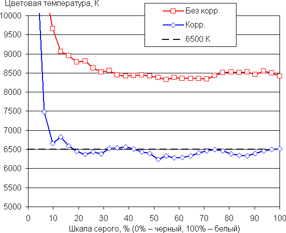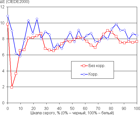 Баланс оттенков на шкале серого средний, так как цветовая температура сильно выше стандартных 6500 К, но отклонение от спектра абсолютно черного тела (ΔE) ниже 10, что для потребительского устройства считается приемлемым показателем. При этом цветовая температура и ΔE мало изменяются от оттенка к оттенку — это положительно сказывается на визуальной оценке цветового баланса. (Самые темные области шкалы серого можно не учитывать, так как там баланс цветов не имеет большого значения, да и погрешность измерений цветовых характеристик на низкой яркости большая.)