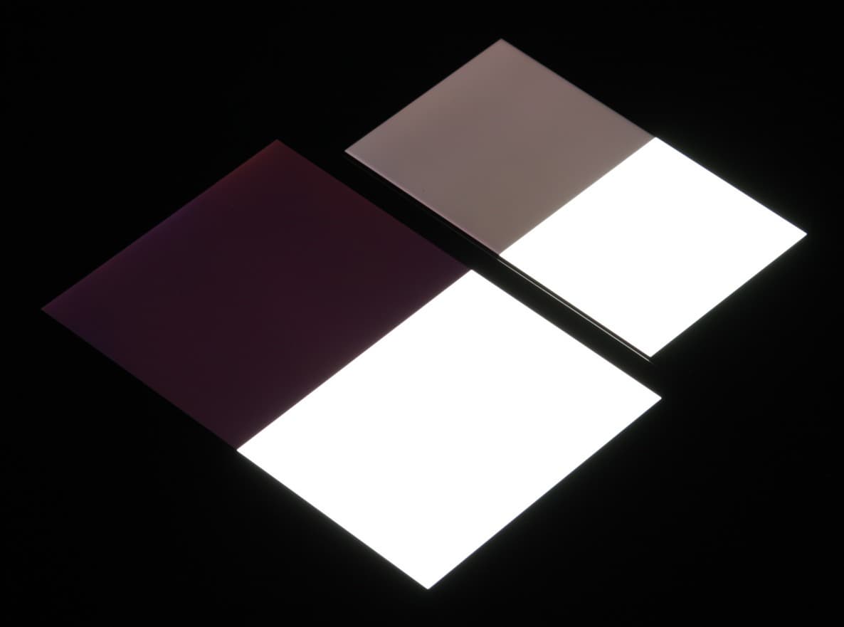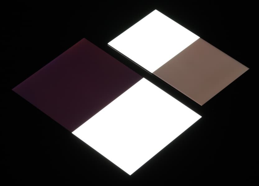 Яркость под углом у экранов уменьшилась (как минимум в 4 раза, исходя из разницы в выдержке), но в случае Meizu 15 Lite падение яркости чуть меньше. Черное поле при отклонении по диагонали высветляется сильно и приобретает красноватый оттенок. Фотографии ниже это демонстрируют (яркость белых участков в перпендикулярном плоскости экранов направлении одинаковая!):