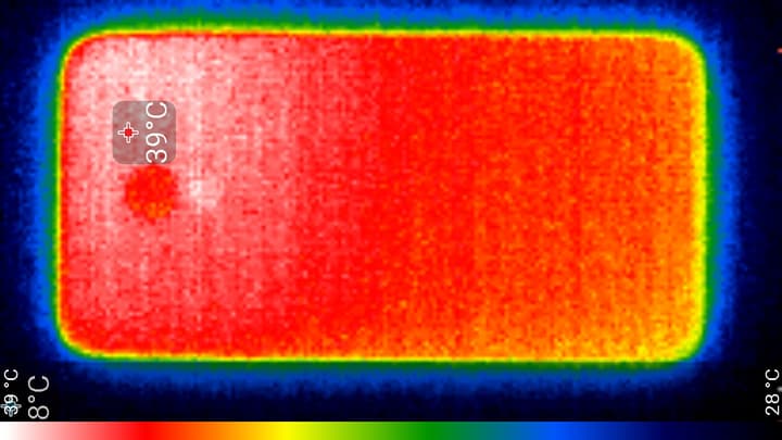 Нагрев немного выше в верхней части аппарата, что, видимо, соответствует расположению микросхемы SoC. В целом задняя поверхность смартфона нагрета почти равномерно. По данным теплокамеры, максимальный нагрев составил 39 градусов (при температуре окружающего воздуха в 24 градуса), это средний нагрев.
