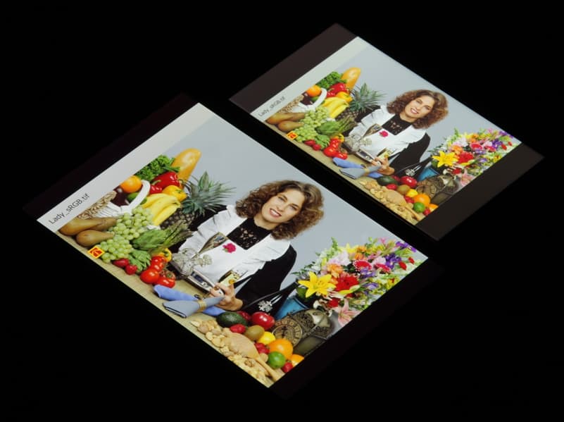 Они типичные для многих топовых мобильных устройств. По всей видимости, в этом экране используются светодиоды с синим излучателем и зеленым и красным люминофором (обычно — синий излучатель и желтый люминофор), что в сочетании со специальными светофильтрами матрицы и позволяет получить широкий цветовой охват. Да, и в красном люминофоре, видимо, используются так называемые квантовые точки. К сожалению, в итоге цвета изображений — рисунков, фотографий и фильмов, — ориентированных на пространство sRGB (а таких подавляющее большинство), имеют неестественную насыщенность. Особенно это заметно на узнаваемых оттенках, например на оттенках кожи. Результат приведен на фотографиях выше.