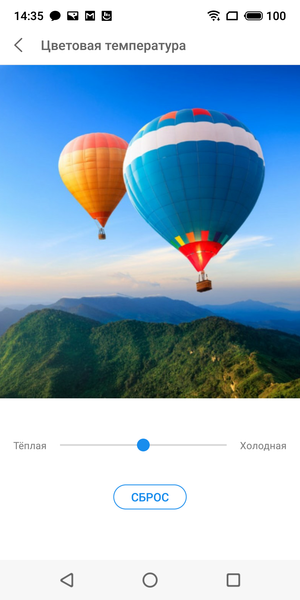 По умолчанию цветовая температура высоковата, порядка 7100 К. Однако в настройках есть возможность коррекции цветового баланса ползунком цветовой температуры.