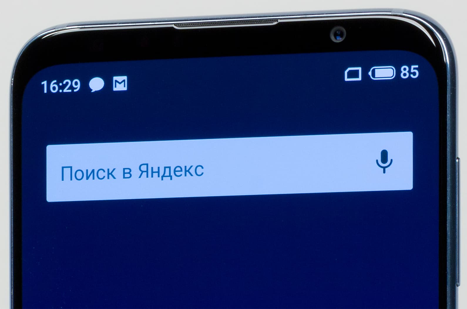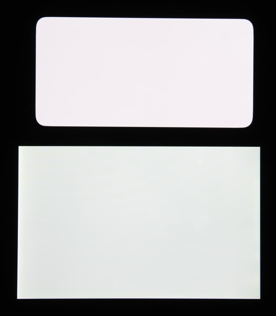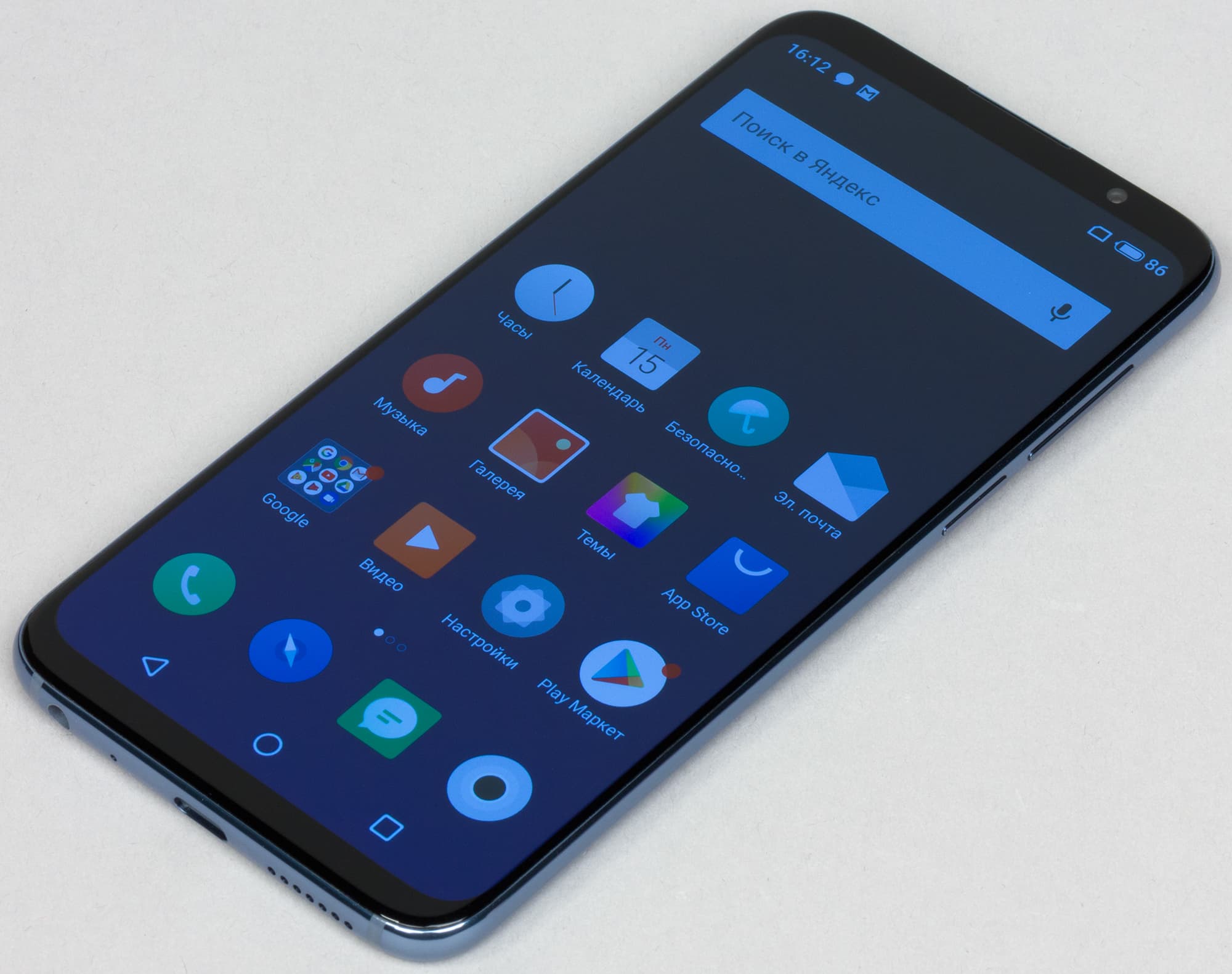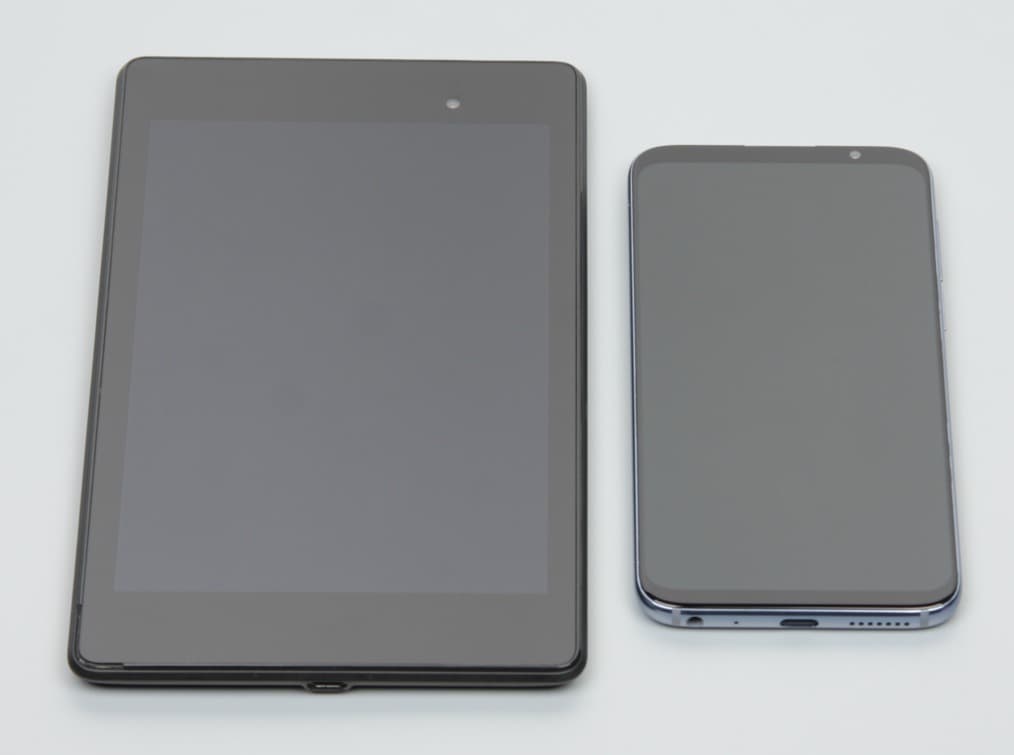 Лицевая поверхность экрана выполнена в виде стеклянной пластины с зеркально-гладкой поверхностью, устойчивой к появлению царапин. Судя по отражению объектов, антибликовые свойства экрана примерно как у экрана Google Nexus 7 (2013) (далее просто Nexus 7). Для наглядности приведем фотографию, на которой в выключенных экранах отражается белая поверхность (слева — Nexus 7, справа — Meizu 16th, далее их можно различать по размеру):