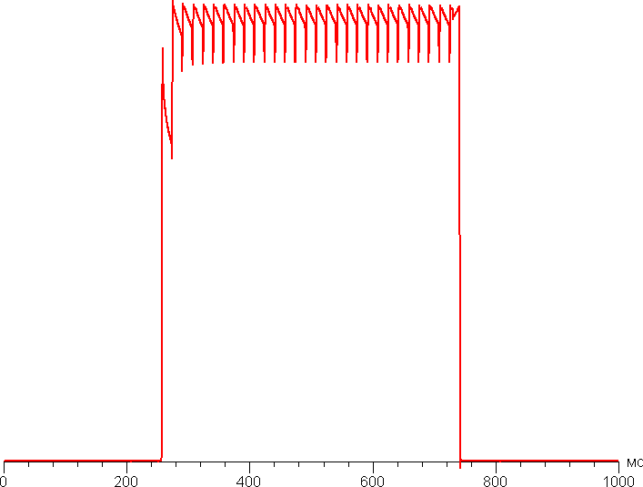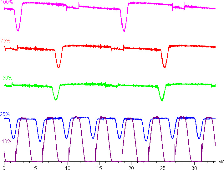 На любом уровне яркости присутствует значимая модуляция с частотой примерно 60 или 240 Гц. На рисунке ниже приведены зависимости яркости (вертикальная ось) от времени (горизонтальная ось) для нескольких значений настройки яркости: