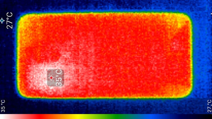 Нагрев относительно равномерный, но все чуть больше локализован в верхней правой части аппарата, что, видимо, соответствует расположению микросхемы SoC. По данным теплокамеры, максимальный нагрев составил всего 35 градусов (при температуре окружающего воздуха в 24 градуса), это относительно немного.