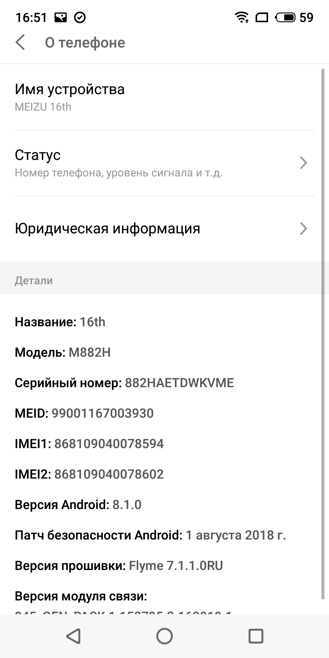 Основные характеристики Meizu 16th (модель M882H)
