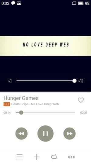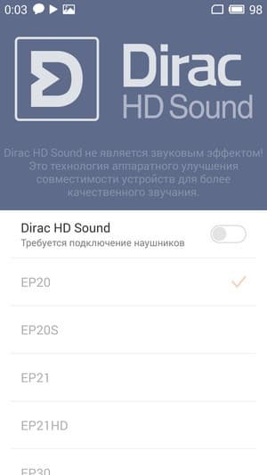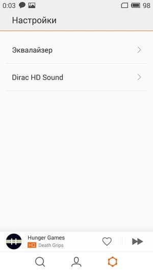 Для воспроизведения музыки используется фирменный проигрыватель с крупным виджетом на весь экран. В настройках плеера имеется возможность использовать эквалайзер с предустановленными значениями, а также использовать функцию улучшения качества звучания с помощью выбора из нескольких различных профилей системы Dirac HD Sound, но все это становится доступным лишь при подключении наушников.