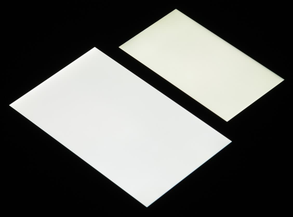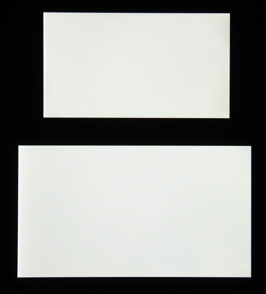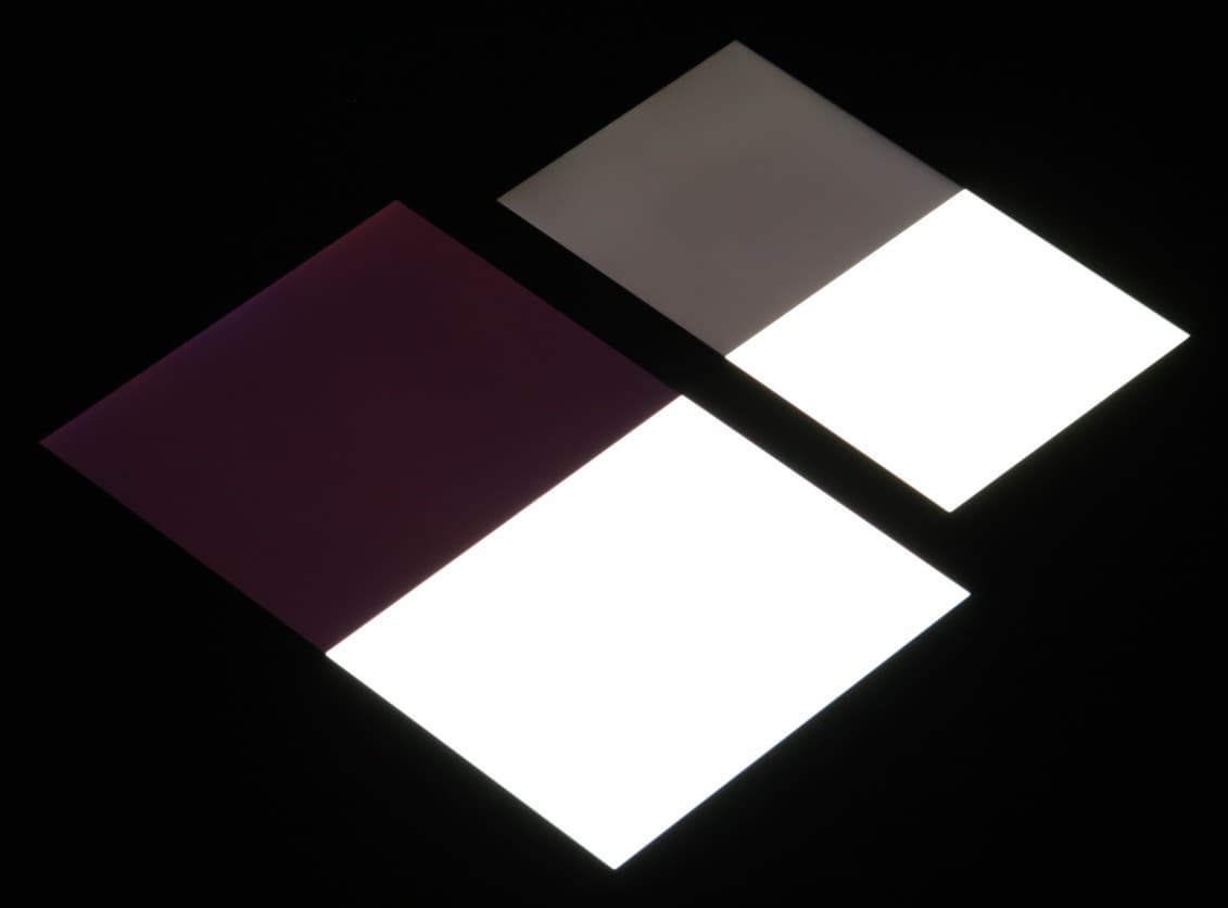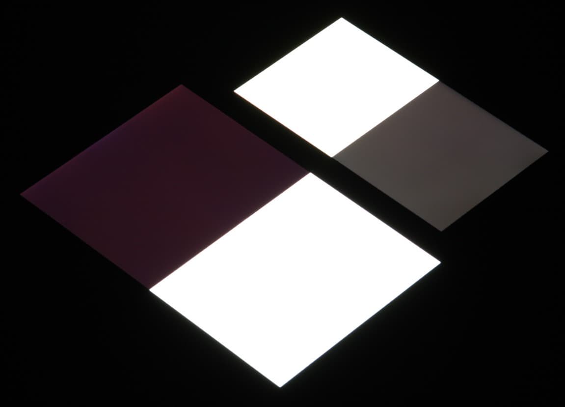 Яркость под углом у экранов уменьшилась (как минимум в 5 раз, исходя из разницы в выдержке). Впрочем, экран Meizu M2 Note под этим углом чуть темнее. Черное поле при отклонении по диагонали высветляется сильно, но остается условно нейтрально-серым по оттенку. Фотографии ниже это демонстрируют (яркость белых участков в перпендикулярном плоскости экранов направлении примерно одинаковая!):