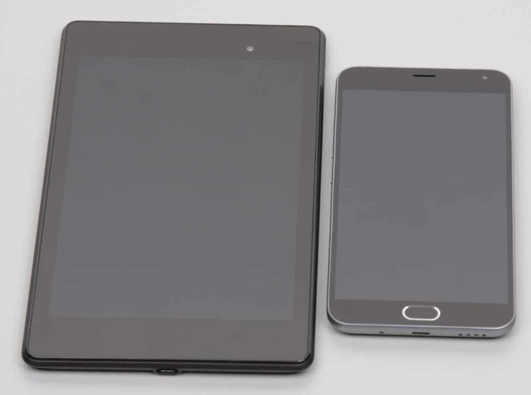 Лицевая поверхность экрана выполнена в виде стеклянной пластины с зеркально-гладкой поверхностью, устойчивой к появлению царапин. Судя по отражению объектов антибликовые свойства экрана может чуть хуже, чем у экрана Google Nexus 7 (2013) (далее просто Nexus 7). Для наглядности приведем фотографию, на которой в выключенных экранах отражается белая поверхность (слева — Nexus 7, справа — Meizu M2 Note, далее их можно различать по размеру):