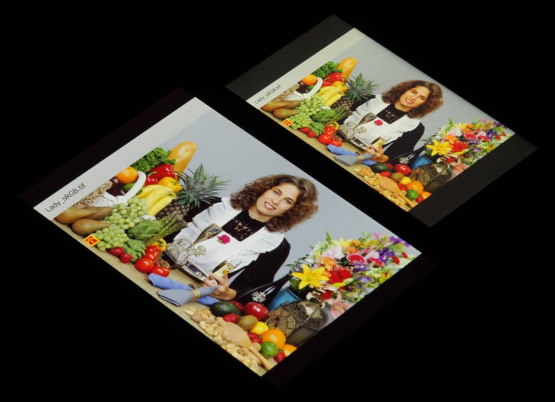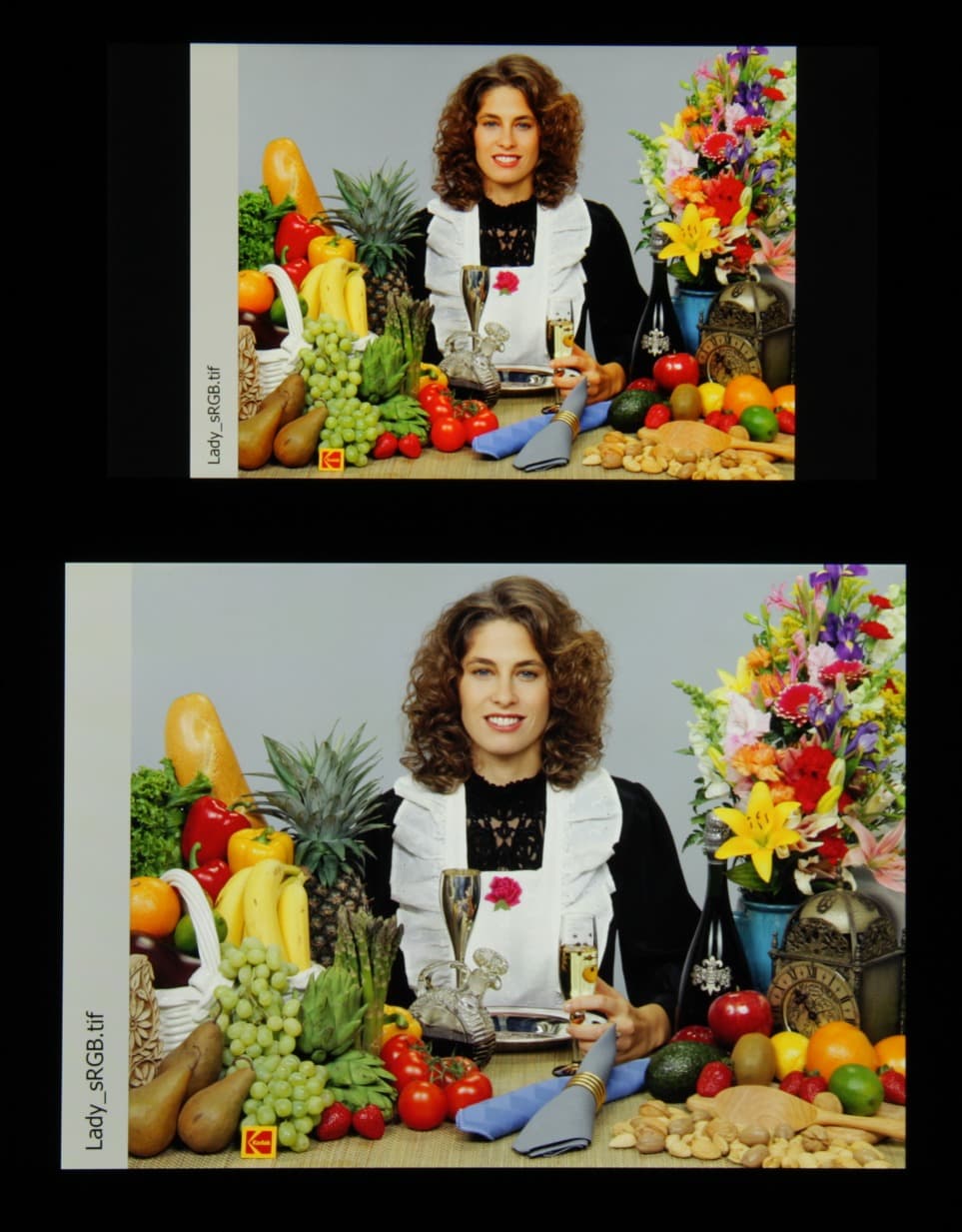 В итоге визуально цвета имеют естественную насыщенность. Баланс оттенков на шкале серого хороший, так как цветовая температура близка к стандартным 6500 К, а отклонение от спектра абсолютно черного тела (ΔE) меньше 10, что для потребительского устройства считается приемлемым показателем. При этом цветовая температура и ΔE мало изменяются от оттенка к оттенку — это положительно сказывается на визуальной оценке цветового баланса. (Самые темные области шкалы серого можно не учитывать, так как там баланс цветов не имеет большого значения, да и погрешность измерений цветовых характеристик на низкой яркости большая.)