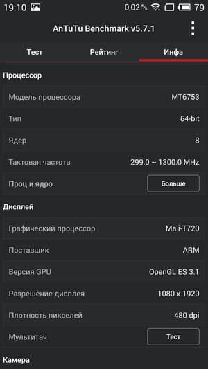 - SoC MediaTek MT6753, 1,3 ГГц, 8 ядер, ARM Cortex-A53