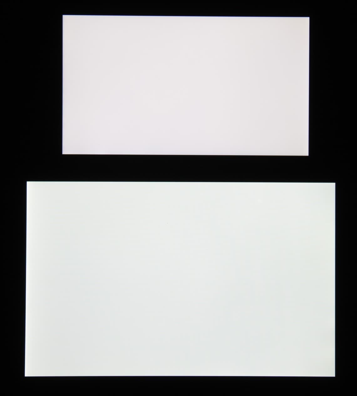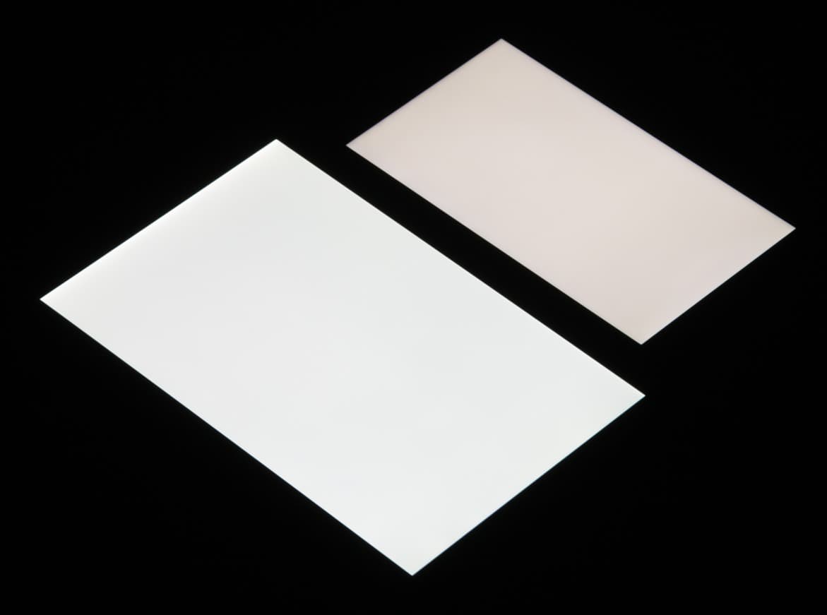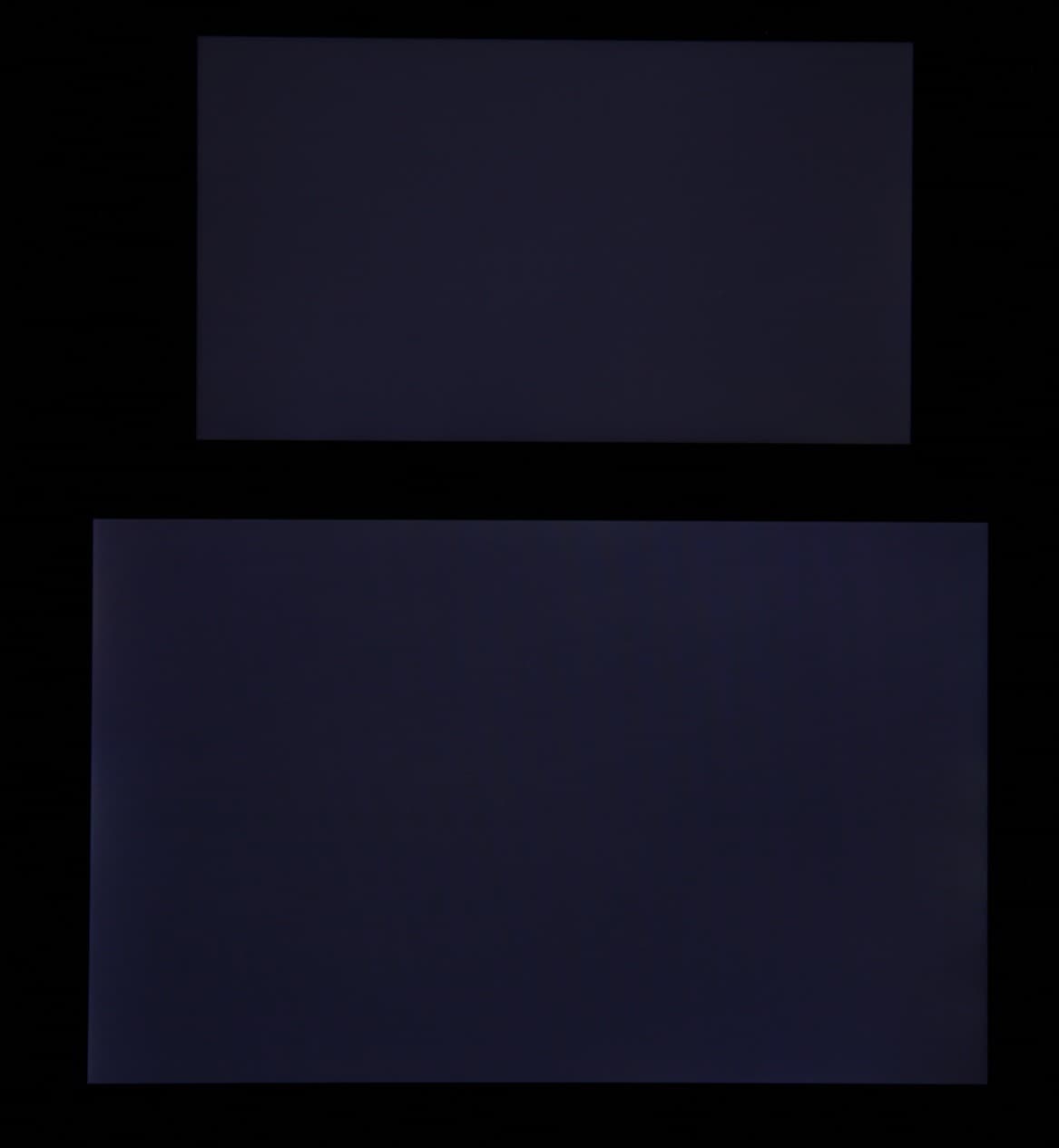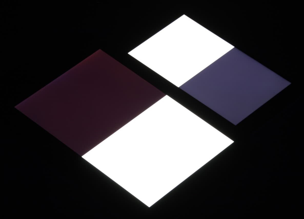 Яркость под углом у экранов уменьшилась (как минимум в 5 раз, исходя из разницы в выдержке), но у Meizu M3 Note экран все же немного темнее. Черное поле при отклонении по диагонали высветляется сильно и приобретает фиолетовый или красноватый оттенок. Фотографии ниже это демонстрируют (яркость белых участков в перпендикулярном плоскости экранов направлении одинаковая!):