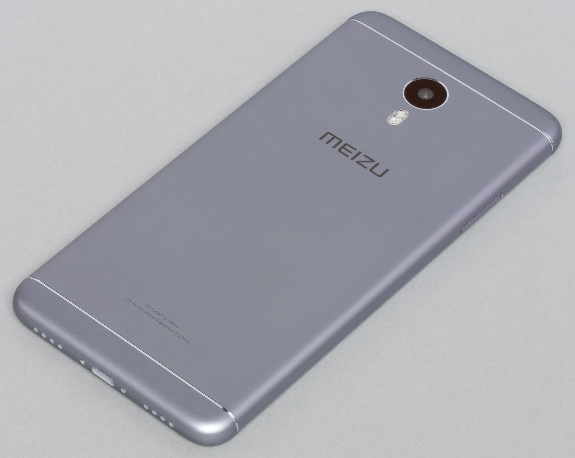 Все поверхности имеют твердое, но матовое покрытие, которое не только не собирает отпечатки пальцев, но и не скользит в руке. Смартфон сам по себе довольно крупный и тяжелый, но благодаря своему покрытию удерживается комфортно. Появление царапин, конечно, возможно, быстрее всего они будут появляться на пластике торцов, но в целом корпус Meizu M3 Note можно назвать практичным и выносливым.