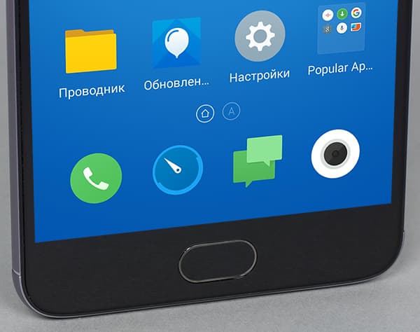 Внизу под экраном, как обычно, не три кнопки, а одна, она расположена по центру и имеет овальную форму. Это механическая клавиша, имеющая встроенную площадку сканера отпечатков пальцев. Кнопка отрабатывает функцию возврата назад при касании и функцию перехода к домашнему экрану при нажатии, разблокировку можно осуществлять прикосновением пальца, поднесенного под любым углом. Сканер отпечатков пальцев mTouch 2.1 с высокой скоростью (0,2 секунды) умеет распознавать отпечатки владельца не только для разблокировки экрана, но и для авторизации доступа к любым приложениям. Подсветки центральная клавиша не имеет; не имеет она и соседних кнопок, привычных по другим смартфонам на ОС Android.