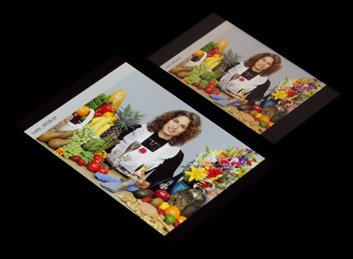 Насыщенность цветов близка к естественной, цветовой баланс в норме. Теперь под углом примерно 45 градусов к плоскости и к стороне экрана: