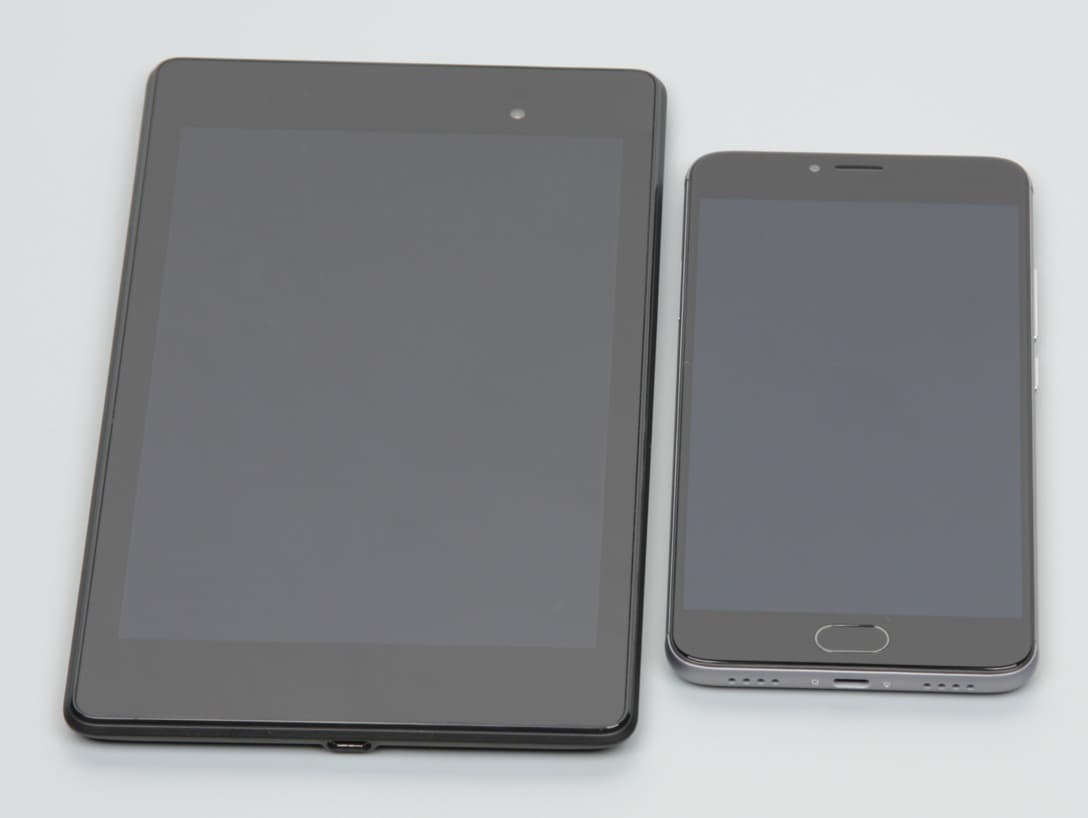 Лицевая поверхность экрана выполнена в виде стеклянной пластины с зеркально-гладкой поверхностью, устойчивой к появлению царапин. Судя по отражению объектов антибликовые свойства экрана не хуже, чем у экрана Google Nexus 7 (2013) (далее просто Nexus 7). Для наглядности приведем фотографию, на которой в выключенных экранах отражается белая поверхность (слева — Nexus 7, справа — Meizu M3 Note, далее их можно различать по размеру):