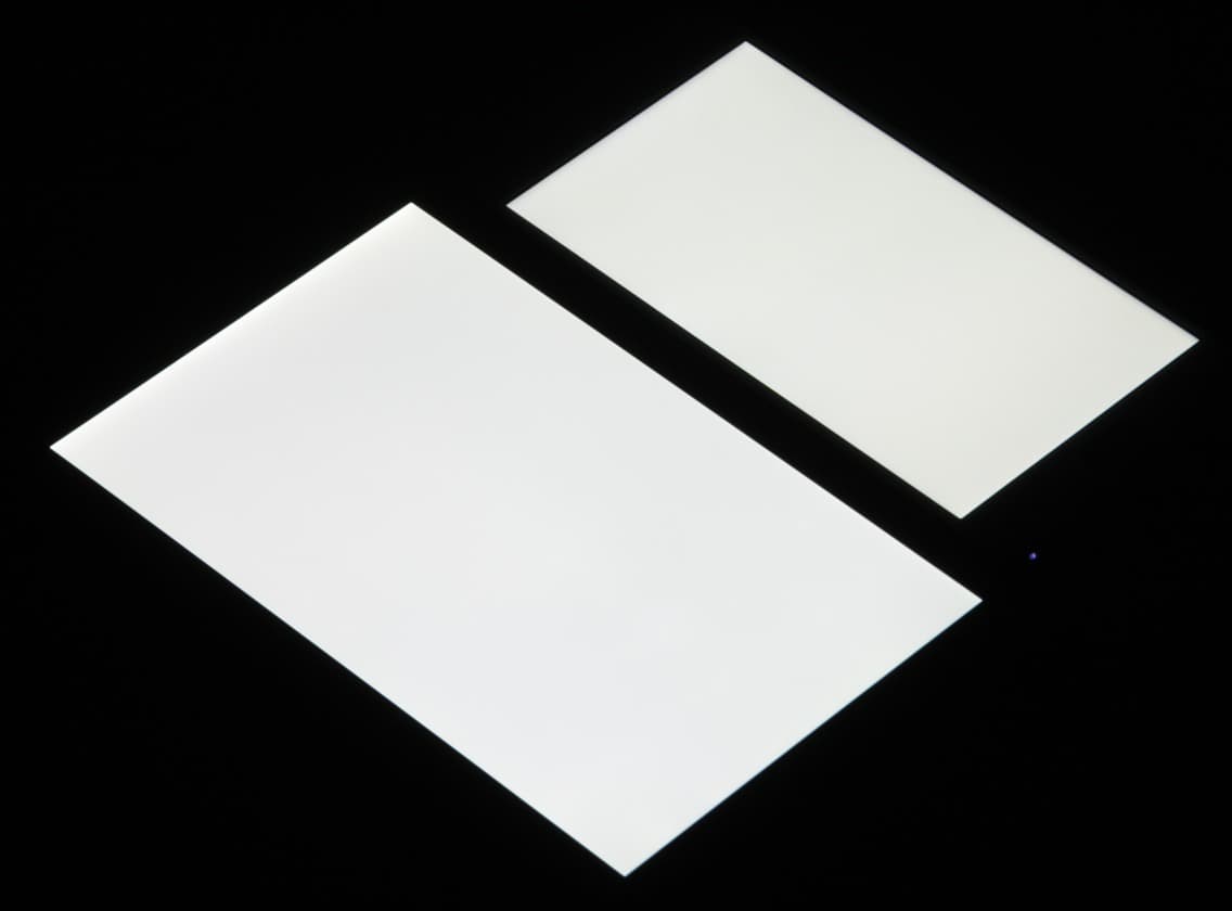 Лицевая поверхность экрана выполнена в виде стеклянной пластины с зеркально-гладкой поверхностью, устойчивой к появлению царапин. Судя по отражению объектов антибликовые свойства экрана чуть хуже, чем у экрана Google Nexus 7 (2013) (далее просто Nexus 7). Для наглядности приведем фотографию, на которой в выключенных экранах отражается белая поверхность (слева — Nexus 7, справа — Meizu M5 Note, далее их можно различать по размеру):