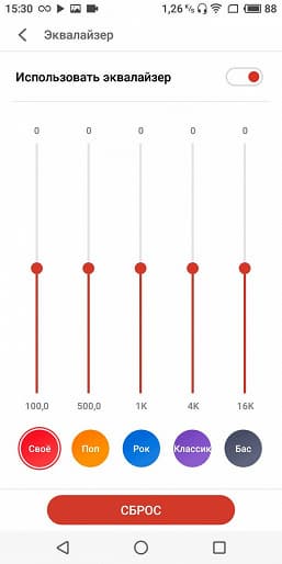 Для проигрывания музыки используется знакомый аудиопроигрыватель с 5-полосным эквалайзером с пресетами. Звук смартфона не особо впечатляет: динамик звучит чисто и громко, но звонко, без заметного присутствия низких частот. В наушниках звучание получше, да и вообще для смартфона такого ценового уровня со звуком здесь порядок, все на вполне удовлетворительном уровне.