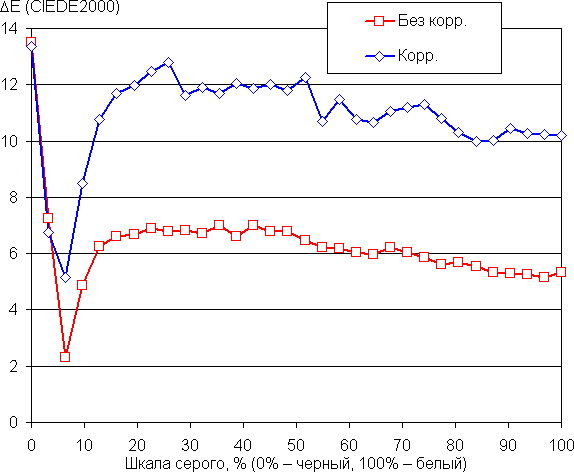В итоге визуально цвета на этом экране несильно отличаются от естественных (помним про небольшое завышение цветового контраста). Баланс оттенков на шкале серого средний, так как цветовая температура сильно выше стандартных 6500 К, но отклонение от спектра абсолютно черного тела (ΔE) ниже 10, что для потребительского устройства считается приемлемым показателем. При этом цветовая температура и ΔE мало изменяются от оттенка к оттенку — это положительно сказывается на визуальной оценке цветового баланса. (Самые темные области шкалы серого можно не учитывать, так как там баланс цветов не имеет большого значения, да и погрешность измерений цветовых характеристик на низкой яркости большая.)