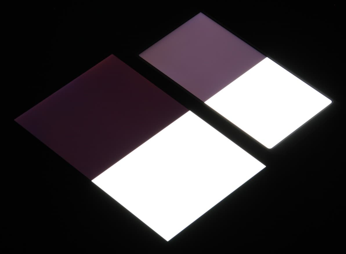 При перпендикулярном взгляде равномерность черного поля средняя, также подсветка немного просвечивает сквозь панели корпуса: