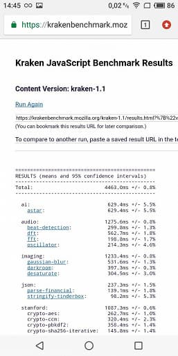 | Mozilla Kraken (мс, меньше — лучше) | 4463 | 9823 | 13369 | 17083 | 9666 |