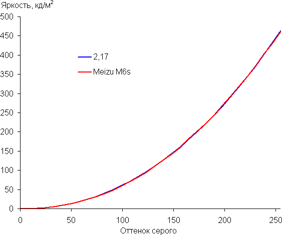 Насыщенность цветов на экране Meizu M6s немного выше естественной. Как показало тестирование, достигается это за счет увеличения цветового контраста. Цветовой баланс у Nexus 7 и тестируемого экрана различается.