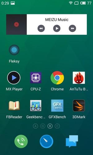 Отдельного меню для приложений нет, все установленные программы размещаются на рабочих столах, поддерживается создание папок и виджетов. Нижний смартбар все так же выдвигается вертикальным жестом снизу вверх, но с него исчез ползунок регулировки яркости, который теперь перебрался на верхнюю панель уведомлений, имеющую возможность раскладываться в два этапа. Очищать смартбар ото всех ранее открытых программ необходимо с помощью жеста, и это, пожалуй, одна из самых неудобных фирменных черт интерфейса. Жестам здесь уделено слишком много внимания, кое-где без них вообще нельзя обойтись, и это не всегда хорошо. Более подробно о плюсах и минусах оболочки Flyme OS описано в обзоре Meizu MX4, нет смысла повторяться, здесь все аналогично.