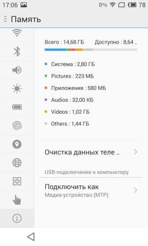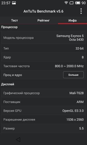 Аппаратная платформа Meizu MX4 Pro построена на совершенно иной SoC, нежели MX4, и это одно из наиболее заметных отличий между двумя моделями. Отличие, впрочем, лишь на физическом уровне, по производительности, на самом деле, обе платформы показывают практически одинаковые результаты. В MX4 Pro используется новейшая SoC Samsung Exynos 5 Octa 5430, знакомая нам уже по смартфону Samsung Galaxy Alpha. Только здесь у процессорных ядер более высокая максимальная частота: восьмиядерный процессор здесь имеет 4 ядра Cortex-А15, работающих на частоте до 2,0 ГГц, а также 4 ядра Cortex-А7, максимальная рабочая частота которых составляет 1,5 ГГц. Платформа не только очень мощная, но она еще и выполнена по техпроцессу 20 нм, соответственно обещана значительная экономия энергии. Графическим ядром SoC является GPU Mali-T628MP6, работающий на частоте 600 МГц. Объем ОЗУ составляет 3 ГБ, покупателю на выбор предоставляются модификации с 16, 32 или 64 ГБ встроенного флэш-массива памяти, и увеличить этот объем с помощью карт памяти уже будет нельзя. В случае с минимальным объемом пользователю для его нужд достанется около 11,5 ГБ из номинально обозначенных 16 ГБ.