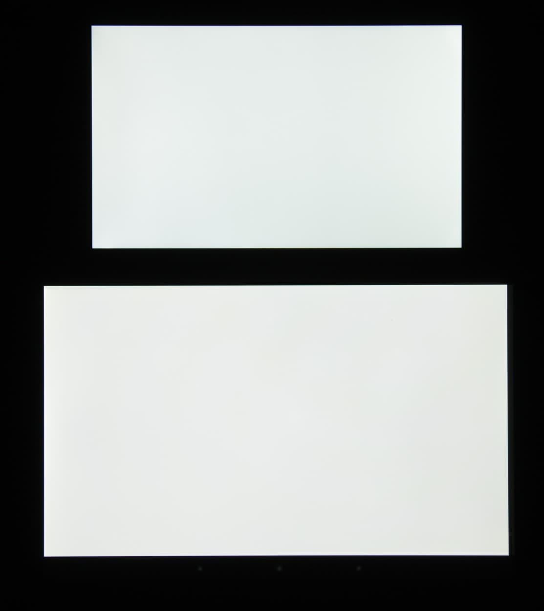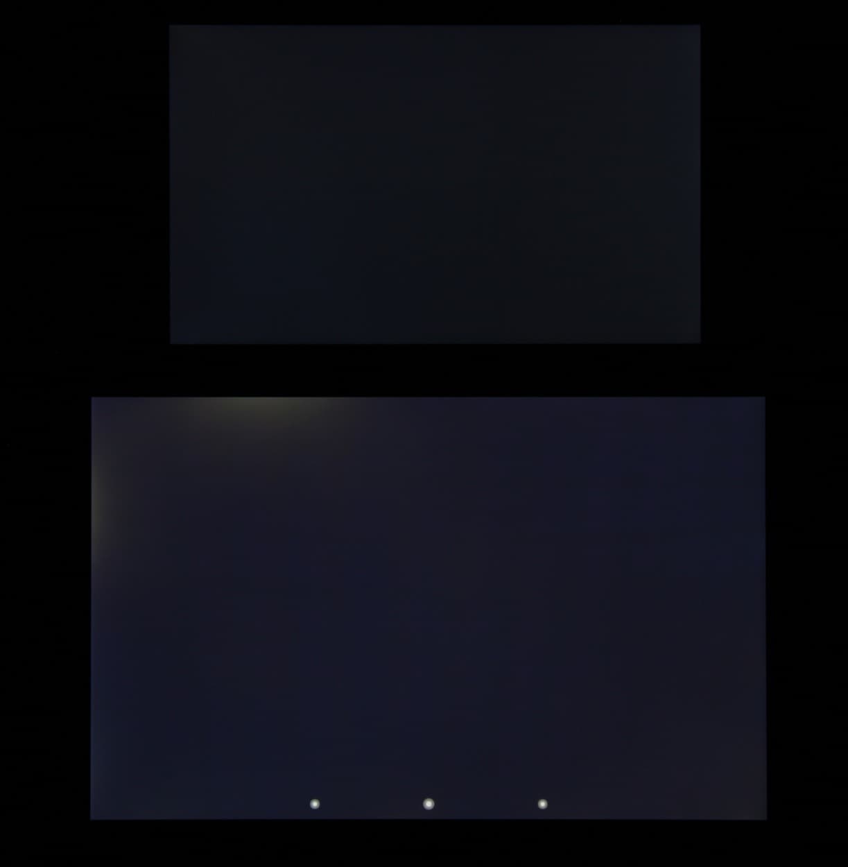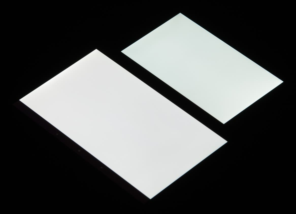 Яркость под углом у экранов уменьшилась (как минимум в 5 раз, исходя из разницы в выдержке), и уменьшилась примерно на одинаковую величину. Черное поле при отклонении по диагонали высветляется слабо и приобретает фиолетовый или красно-фиолетовый оттенок. Фотографии ниже это демонстрируют (яркость белых участков в перпендикулярном плоскости экранов направлении примерно одинаковая!):