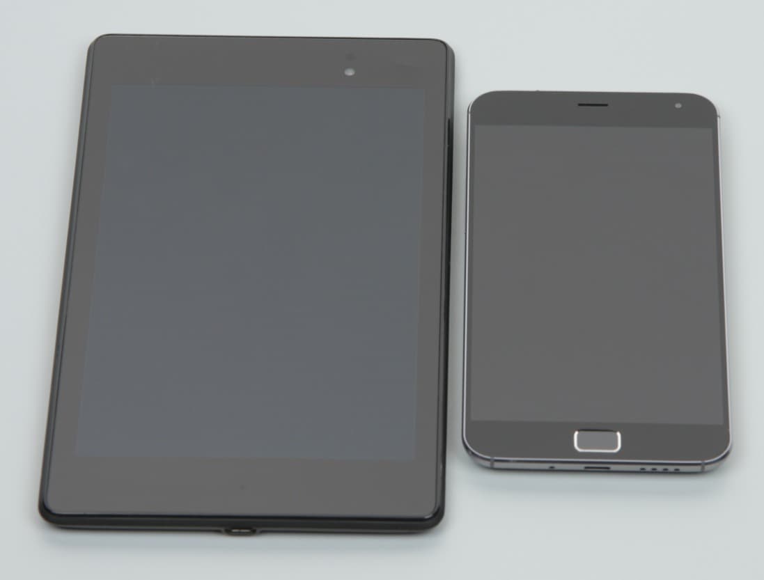Лицевая поверхность экрана выполнена в виде стеклянной пластины с зеркально-гладкой поверхностью, устойчивой к появлению царапин. Судя по отражению объектов антибликовые свойства экрана не хуже, чем у экрана Google Nexus 7 (2013) (далее просто Nexus 7). Для наглядности приведем фотографию, на которой в выключенных экранах отражается белая поверхность (слева — Nexus 7, справа — Meizu MX4 Pro, далее их можно различать по размеру):