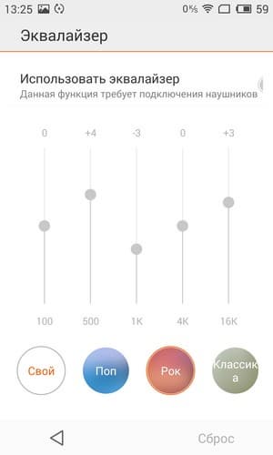 Для управления качеством звучания имеется возможность задействовать несколько различных профилей, в том числе и для работы с внешними аудиосистемами. Доступ к настройкам активируется только когда подключены наушники или аудиосистема. Для воспроизведения музыки здесь предусмотрен фирменный проигрыватель. В его настройках имеется возможность использовать эквалайзер с предустановленными значениями.