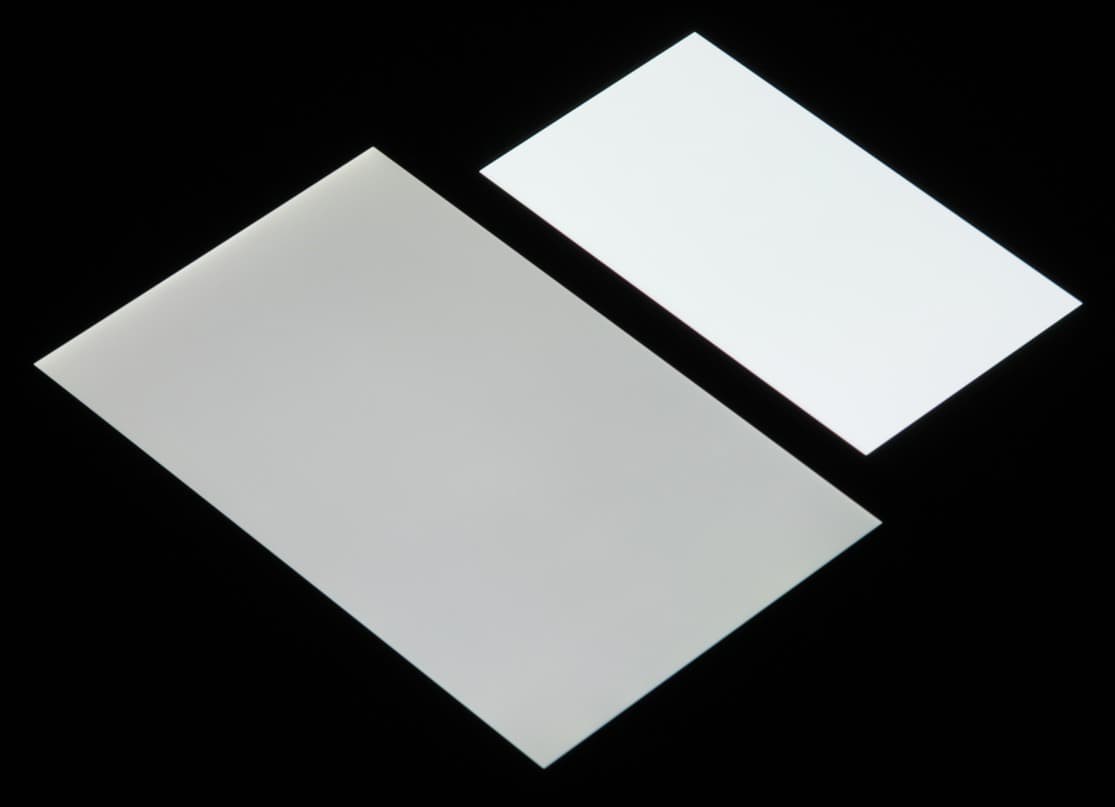 Экран характеризуется великолепными углами обзора, правда белый цвет при отклонении даже на небольшие углы приобретает легкий сине-зеленый оттенок, а под некоторыми углами чуть-чуть розовеет, но черный цвет остается просто черным под любыми углами. Он настолько черный, что параметр контрастности в данном случае просто неприменим. При перпендикулярном взгляде равномерность белого поля хорошая. Для сравнения приведем фотографии, на которых на экраны Meizu Pro 6 и второго участника сравнения выведены одинаковые изображения, при этом яркость экранов изначально установлена примерно на 200 кд/м², а цветовой баланс на фотоаппарате принудительно переключен на 6500 К. Перпендикулярно к экранам белое поле: