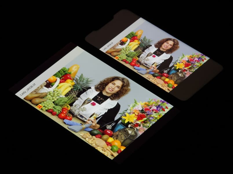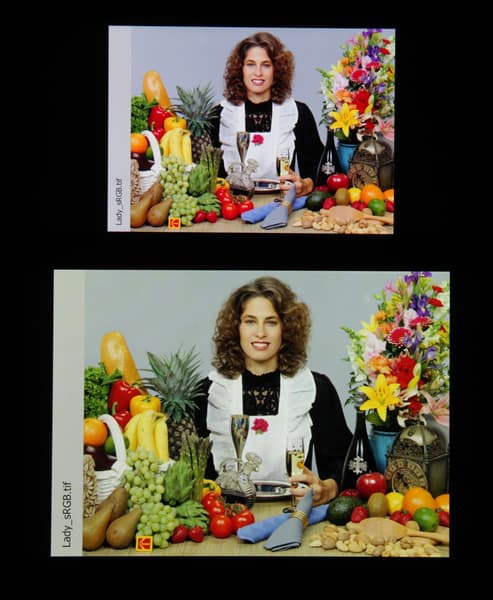 Спектры компонент достаточно хорошо разделены, что и обуславливает широкий цветовой охват. К сожалению, в итоге цвета изображений — рисунков, фотографий и фильмов, — ориентированных на пространство sRGB (а таких подавляющее большинство), имеют неестественную насыщенность. Особенно это заметно на узнаваемых оттенках, например на оттенках кожи. Результат приведен на фотографиях выше.