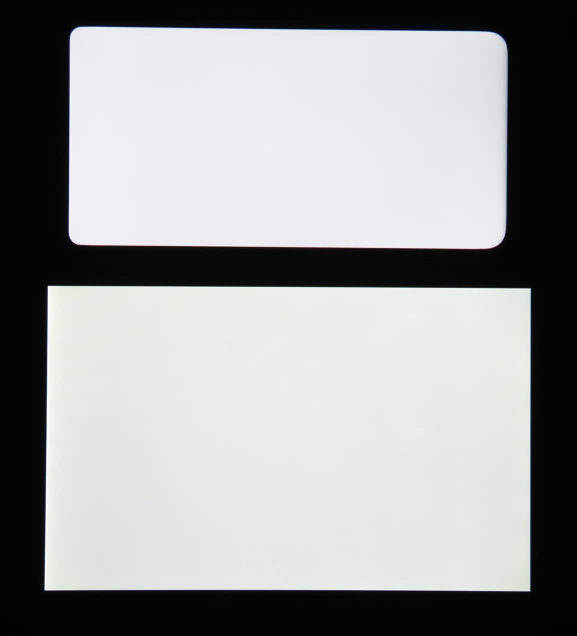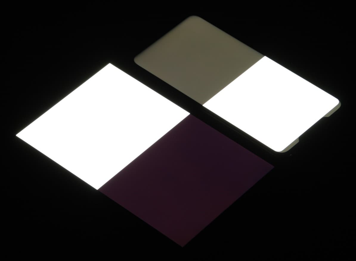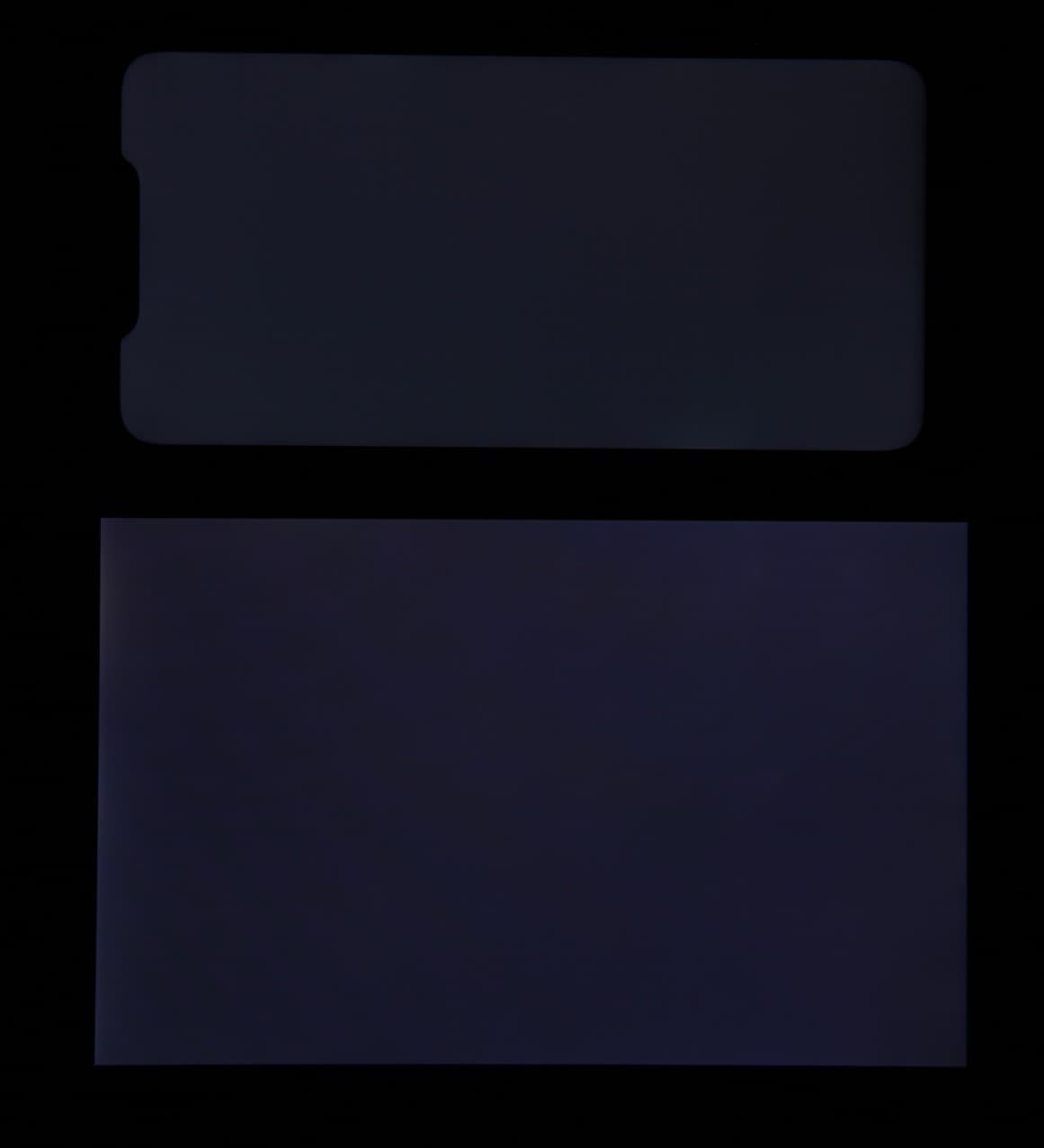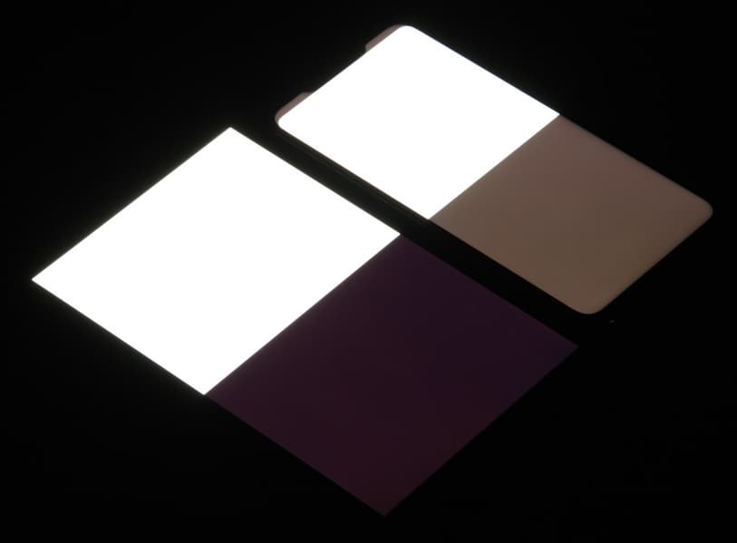 Яркость под углом у экранов уменьшилась (как минимум в 5 раз, исходя из разницы в выдержке), но в случае Meizu X8 падение яркости больше. Черное поле при отклонении по диагонали высветляется сильно и приобретает красноватый оттенок или остается условно нейтрально-серым. Фотографии ниже это демонстрируют (яркость белых участков в перпендикулярном плоскости экранов направлении одинаковая!):