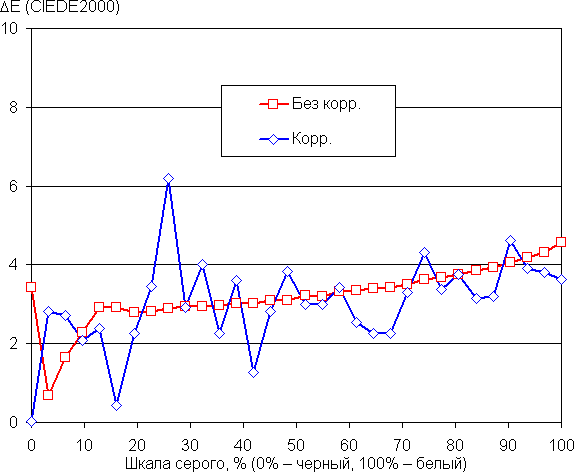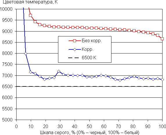 Баланс оттенков на шкале серого средний, так как цветовая температура сильно выше стандартных 6500 К, но отклонение от спектра абсолютно черного тела (ΔE) ниже 10, что для потребительского устройства считается приемлемым показателем. При этом цветовая температура и ΔE мало изменяются от оттенка к оттенку — это положительно сказывается на визуальной оценке цветового баланса. (Самые темные области шкалы серого можно не учитывать, так как там баланс цветов не имеет большого значения, да и погрешность измерений цветовых характеристик на низкой яркости большая.)