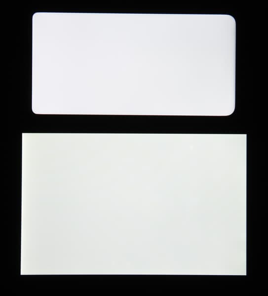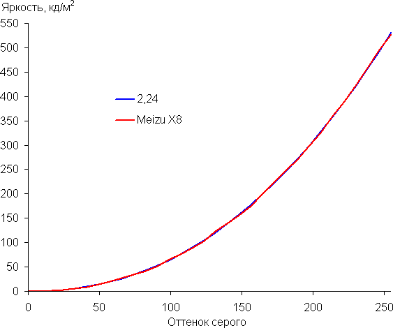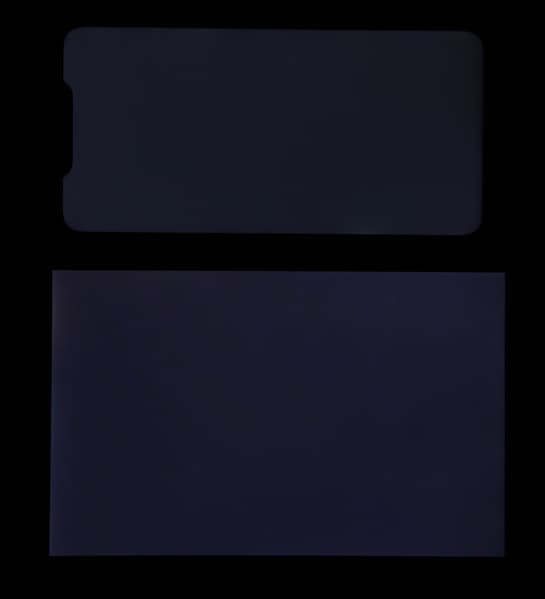 Отметим хорошую равномерность яркости и цветового тона белого поля. Напомним, что фотография не может служить надежным источником сведений о качестве цветопередачи и приводится только для условной наглядной иллюстрации. В частности, выраженный красноватый оттенок белого и серого полей, присутствующий на фотографиях экрана Meizu X8, при перпендикулярном взгляде визуально отсутствует, что подтверждается аппаратными тестами с помощью спектрофотометра. Причина в том, что спектральная чувствительность матрицы фотоаппарата неточно совпадает с этой характеристикой человеческого зрения.