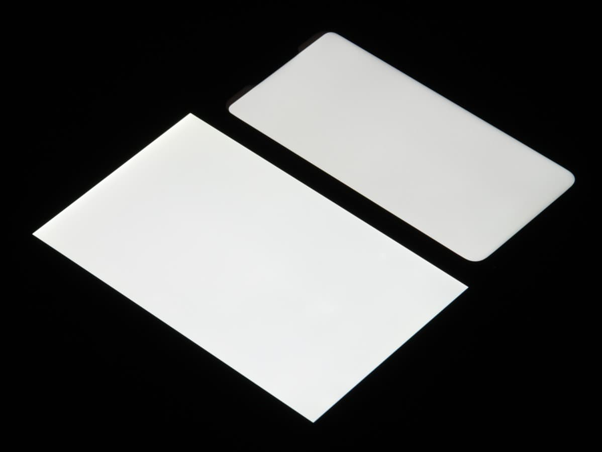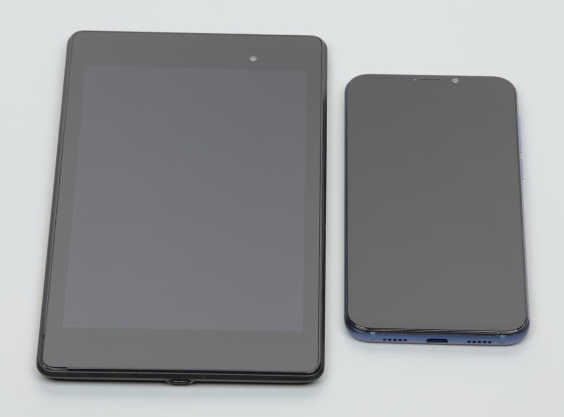Лицевая поверхность экрана выполнена в виде стеклянной пластины с зеркально-гладкой поверхностью, устойчивой к появлению царапин. Судя по отражению объектов, антибликовые свойства экрана чуть лучше, чем у экрана Google Nexus 7 (2013) (далее просто Nexus 7). Для наглядности приведем фотографию, на которой в выключенных экранах отражается белая поверхность (слева — Nexus 7, справа — Meizu X8, далее их можно различать по размеру):