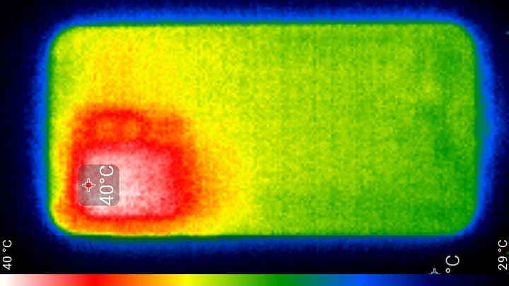 Нагрев локализован в верхней правой части аппарата, что, видимо, соответствует расположению микросхемы SoC. По данным теплокамеры, максимальный нагрев составил 40 градусов (при температуре окружающего воздуха в 24 градуса), это средний нагрев.
