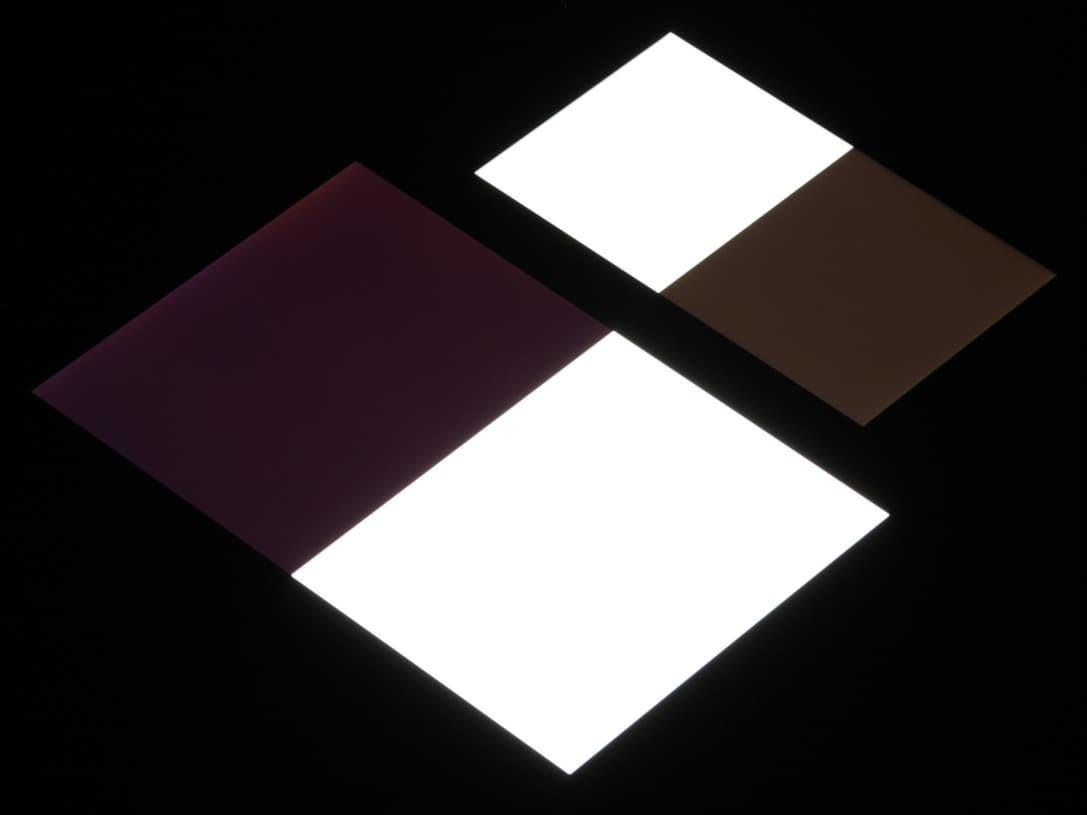 Яркость под углом у экранов уменьшилась (как минимум в 5 раз, исходя из разницы в выдержке), но у Micromax Bolt Warrior 2 экран заметно темнее. Черное поле при отклонении по диагонали высветляется сильно и приобретает красноватый или красно-фиолетовый оттенок. Фотографии ниже это демонстрируют (яркость белых участков в перпендикулярном плоскости экранов направлении одинаковая!):