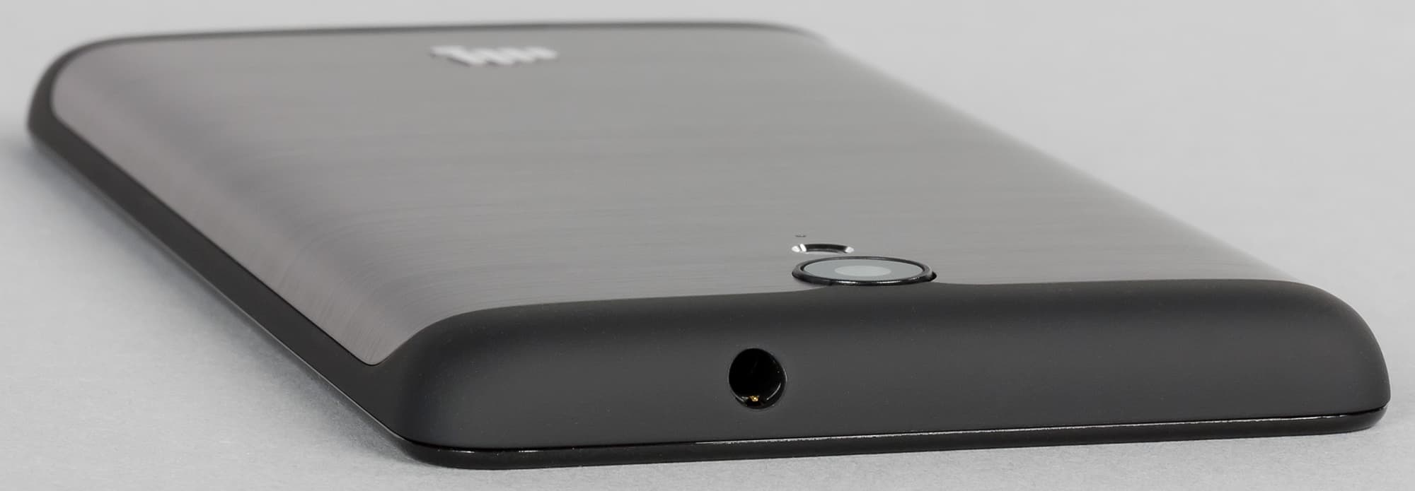 Основной динамик выведен сюда же, на тыльную сторону, но звук лежащего аппарата приглушается не сильно, поскольку отверстие пришлось на скос и оказывается слегка приподнятым над поверхностью стола.